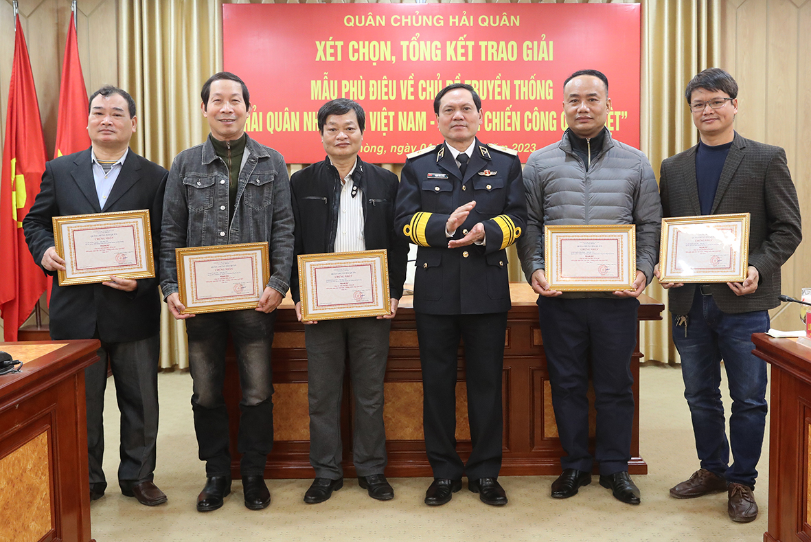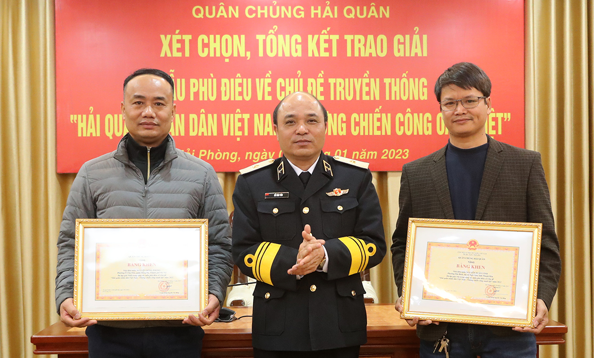 Chuẩn Đô đốc Đỗ Văn Yên trao Giấy khen của Bộ Tư lệnh Hải quân tặng tác giả đạt giải Nhất, Nhì
