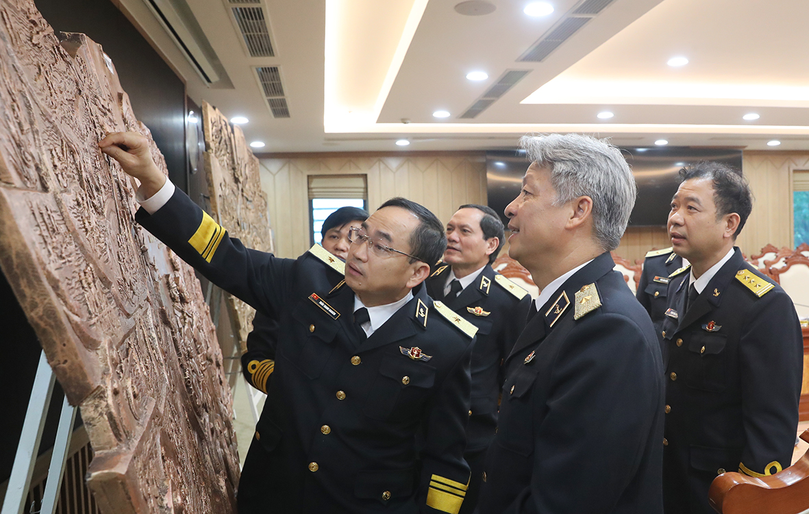 Chuẩn Đô đốc Trần Thanh Nghiêm, Tư lệnh Hải quân; Chuẩn Đô đốc Phạm Mạnh Hùng, Phó Tư lệnh, Tham mưu trưởng Hải quân cùng các thành viên Hội đồng nghệ thuật Hải quân tham quan, góp ý các mẫu phù điêu