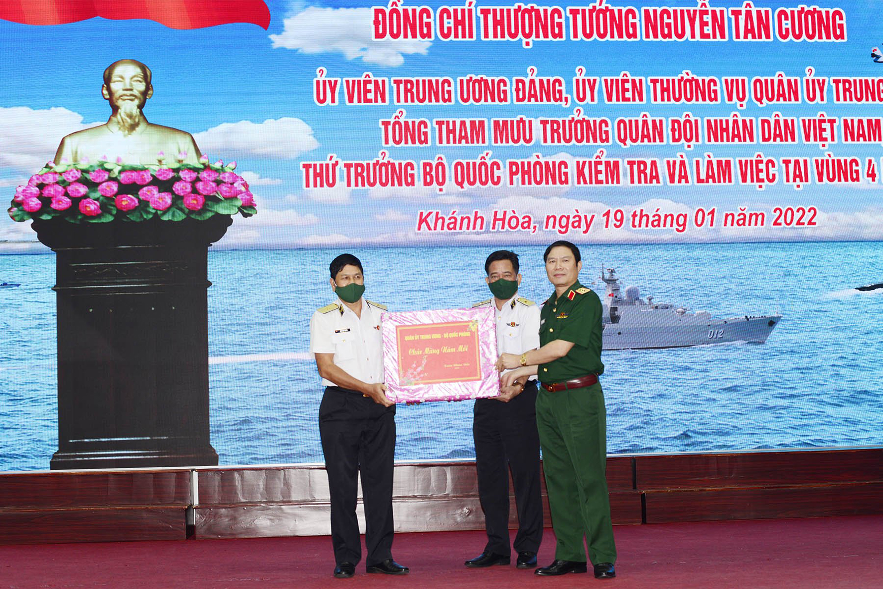 Chuẩn bị đón Xuân Nhâm Dần 2022, Thượng tướng Nguyễn Tân Cương yêu cầu mỗi cán bộ, chiến sĩ Vùng 4 Hải quân cần nêu cao tinh thần cảnh giác, duy trì nghiêm chế độ trực SSCĐ, nắm chắc tình hình, kịp thời xử trí tốt các tình huống, không để bị động, bất ngờ; bảo đảm an toàn phòng, chống dịch Covid-19. Toàn Vùng cần bảo đảm tốt chế độ, tiêu chuẩn, tổ chức cho bộ đội ăn tết chu đáo, vui xuân lành mạnh, an toàn, tiết kiệm, quan tâm đến cán bộ, chiến sĩ có hoàn cảnh khó khăn...