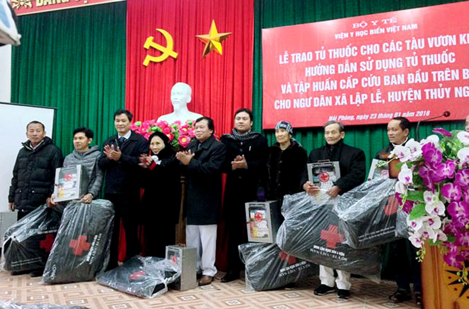 Trao tặng tủ thuốc cho các chủ tàu ở xã Lập Lễ, huyện Thủy Nguyên.