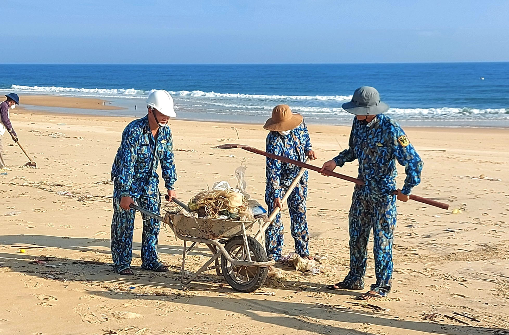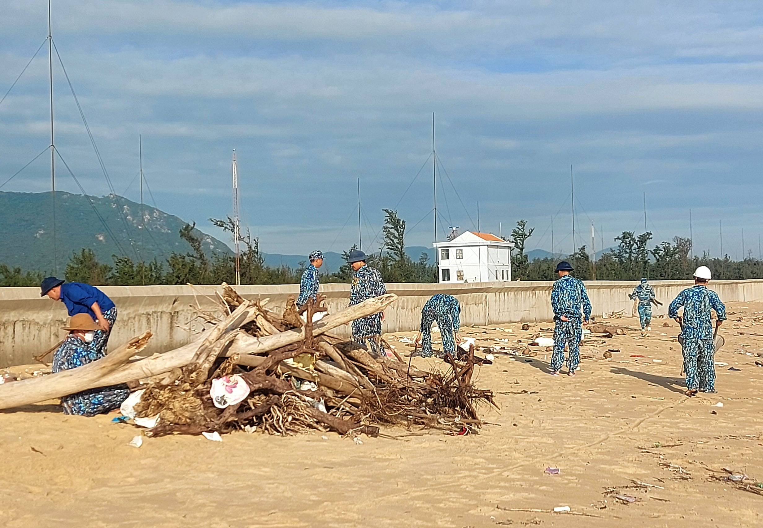 Cán bộ, chiến sĩ Trạm ra đa 3512 thu gom gác trên bờ biển thôn Tân Thắng