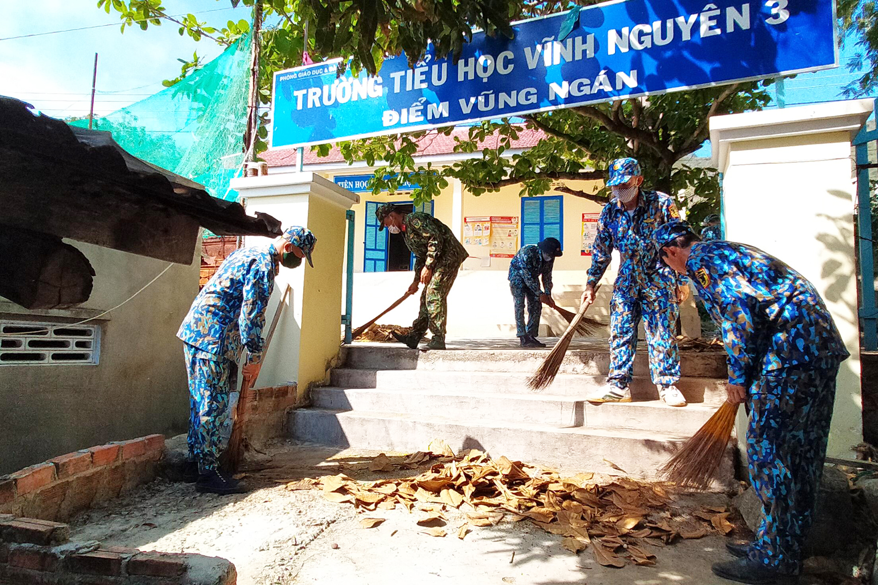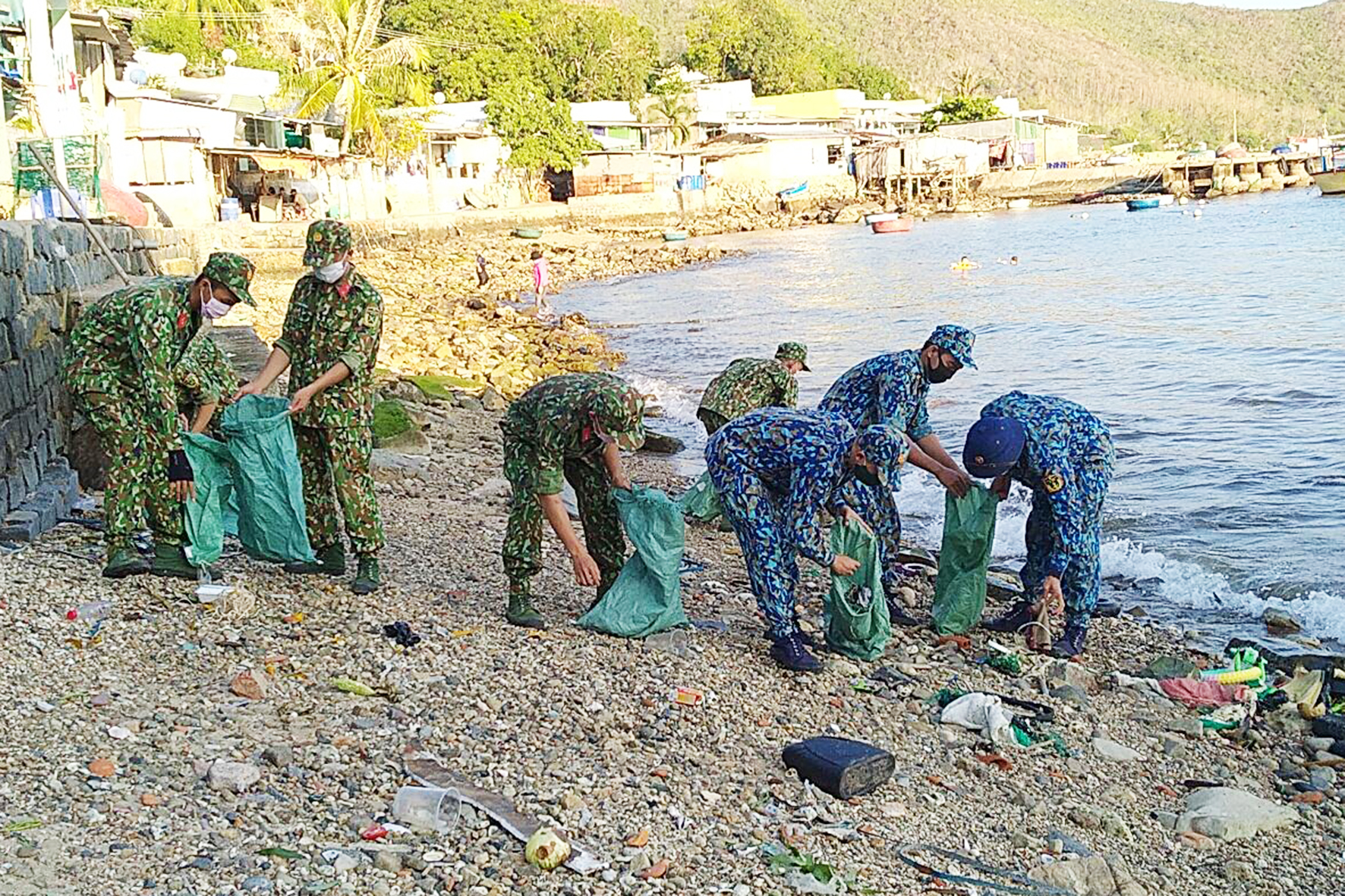 Sáng 1-9, tại TP.Nha Trang, tỉnh Khánh Hòa, cán bộ, đoàn viên Trạm ra đa 565, Trung đoàn 451, Vùng 4 Hải quân phối hợp với Chi đoàn Đại đội hỗn hợp 90, Tỉnh đội Khánh Hòa tham gia vệ sinh môi trường tại thôn Vũng Ngán, phường Vĩnh Nguyên, TP. Nha Trang.