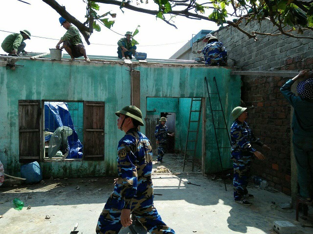 Cán bộ, chiến sĩ Trạm ra đa 535 giúp dân xã Quảng Đông lợp lại mái nhà sau bão
