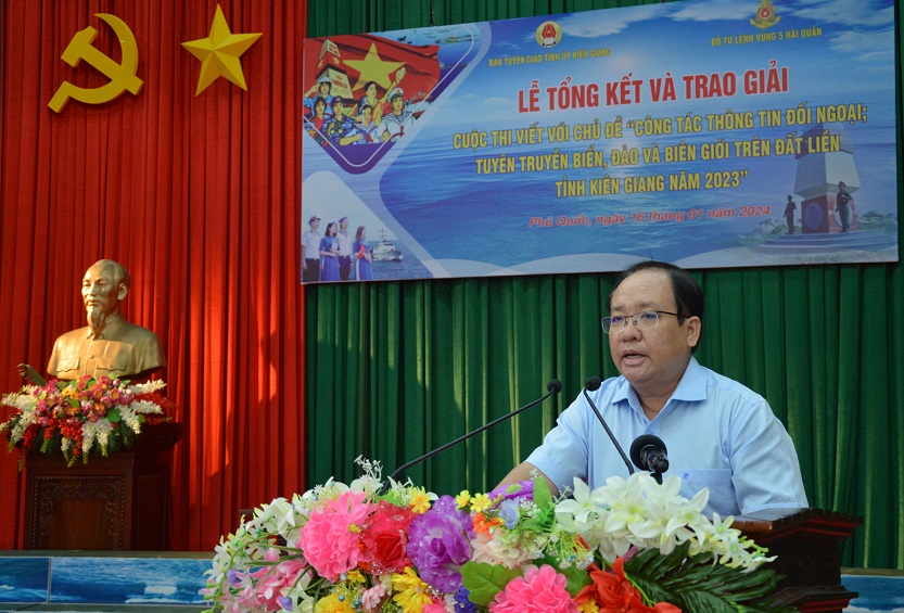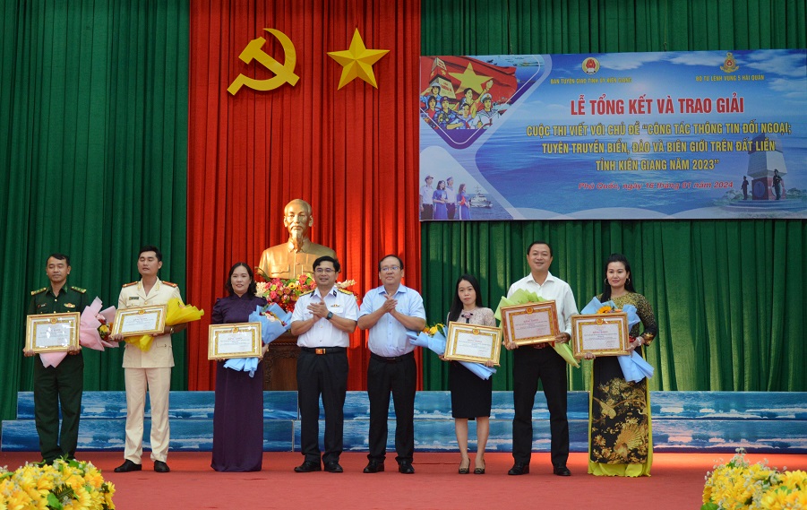Chiều 16/1, tại TP. Phú Quốc, tỉnh Kiên Giang, Ban Tuyên giáo Tỉnh ủy Kiên Giang phối hợp với Bộ Tư lệnh Vùng 5 Hải quân tổ chức Lễ tổng kết và trao giải Cuộc thi viết với chủ đề “Công tác thông tin đối ngoại; tuyên truyền biển, đảo và biên giới trên đất liền” tỉnh Kiên Giang năm 2023.