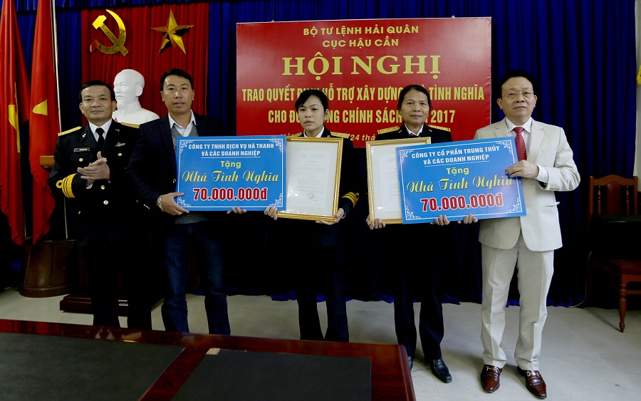 Ngày 24-11, tại Hải Phòng, Cục Hậu cần Hải quân đã trao quyết định hỗ trợ xây dựng nhà tình nghĩa cho Trung uý QNCN Đặng Thị Oanh, Nhân viên nấu ăn, Hải đội 384 và Thiếu uý QNCN Đinh Thị Kim Xoa, Nhân viên nấu ăn, Tiểu đoàn 45 thuộc Cục Hậu cần Hải quân.