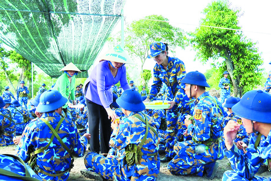 Những ly nước mát, những đĩa trái cây được cán bộ, hội viên phụ nữ Vùng 5 trao tận tay các chiến sĩ trong giờ giải lao. Ảnh: Văn Định