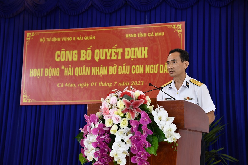 Chiều 1/7, tại tỉnh Cà Mau, Bộ Tư lệnh Vùng 5 Hải quân phối hợp với UBND tỉnh Cà Mau tổ chức Lễ công bố quyết định hoạt động “Hải quân nhận đỡ đầu con ngư dân”. Đại tá Nguyễn Hữu Thoan, Phó Chính ủy Vùng chủ trì buổi lễ.