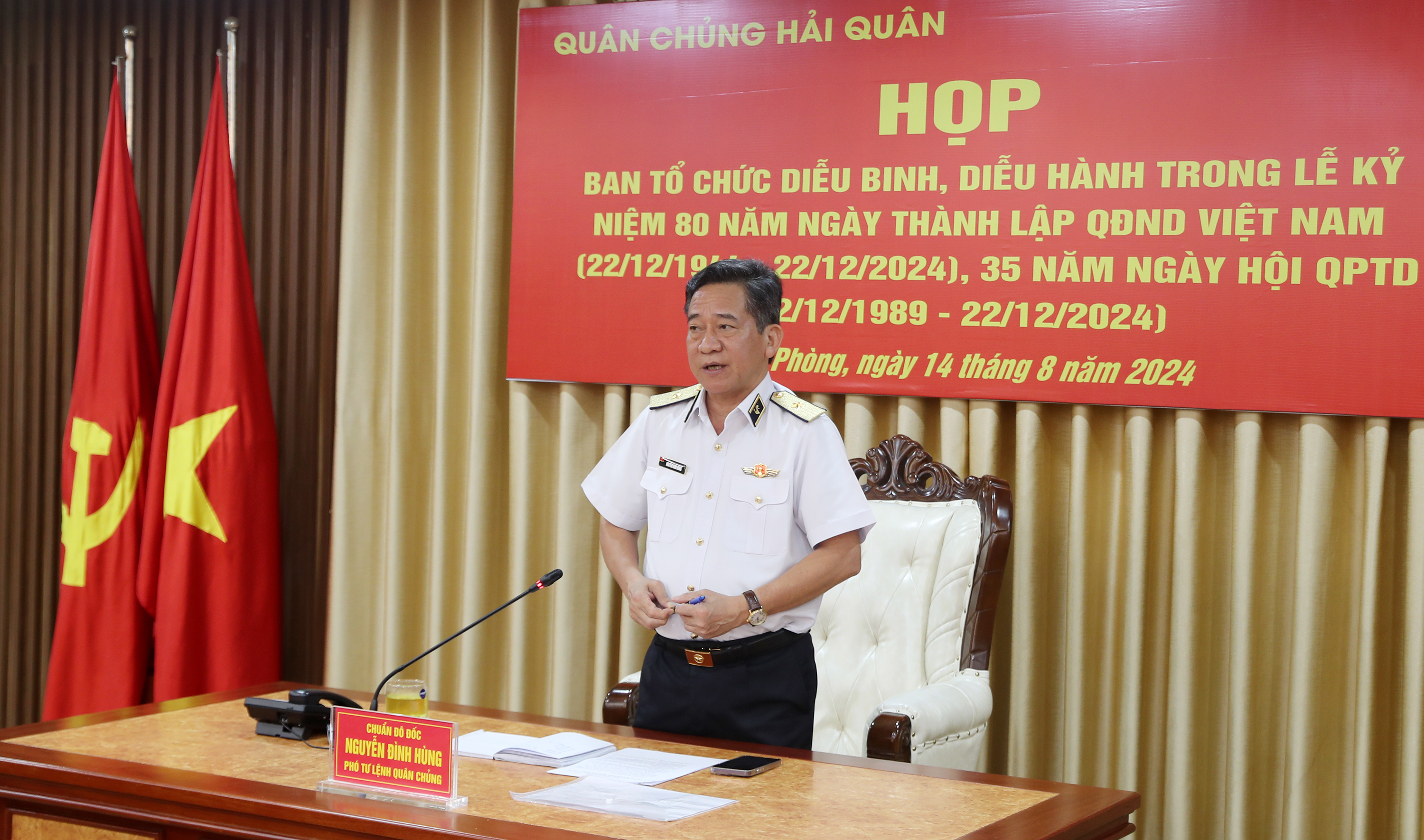 Chiều 14/8, tại Hải Phòng, Quân chủng Hải quân tổ chức họp Ban tổ chức diễu binh, diễu hành trong Lễ kỷ niệm 80 năm ngày thành lập Quân đội nhân dân Việt Nam (22/12/1944 – 22/12/2024). Chuẩn Đô đốc Nguyễn Đình Hùng, Phó Tư lệnh Hải quân chủ trì.