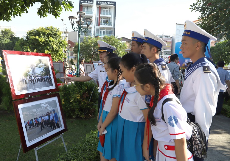 Cán bộ, chiến sĩ Vùng 3 cùng các em học sinh tham quan triển lãm