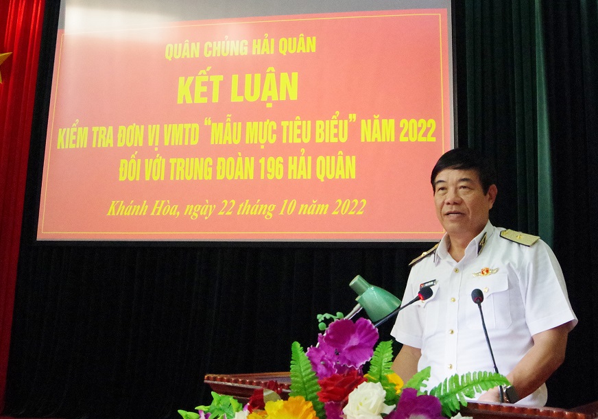 Ngày 22/10, tại TP. Cam Ranh, tỉnh Khánh Hòa, đoàn kiểm tra của Quân chủng Hải quân do Chuẩn Đô đốc Phan Tuấn Hùng, Phó Tư lệnh Hải quân làm trưởng đoàn đã kiểm tra kết quả xây dựng đơn vị VMTD mẫu mực, tiêu biểu năm 2022 đối với Trung đoàn 196.