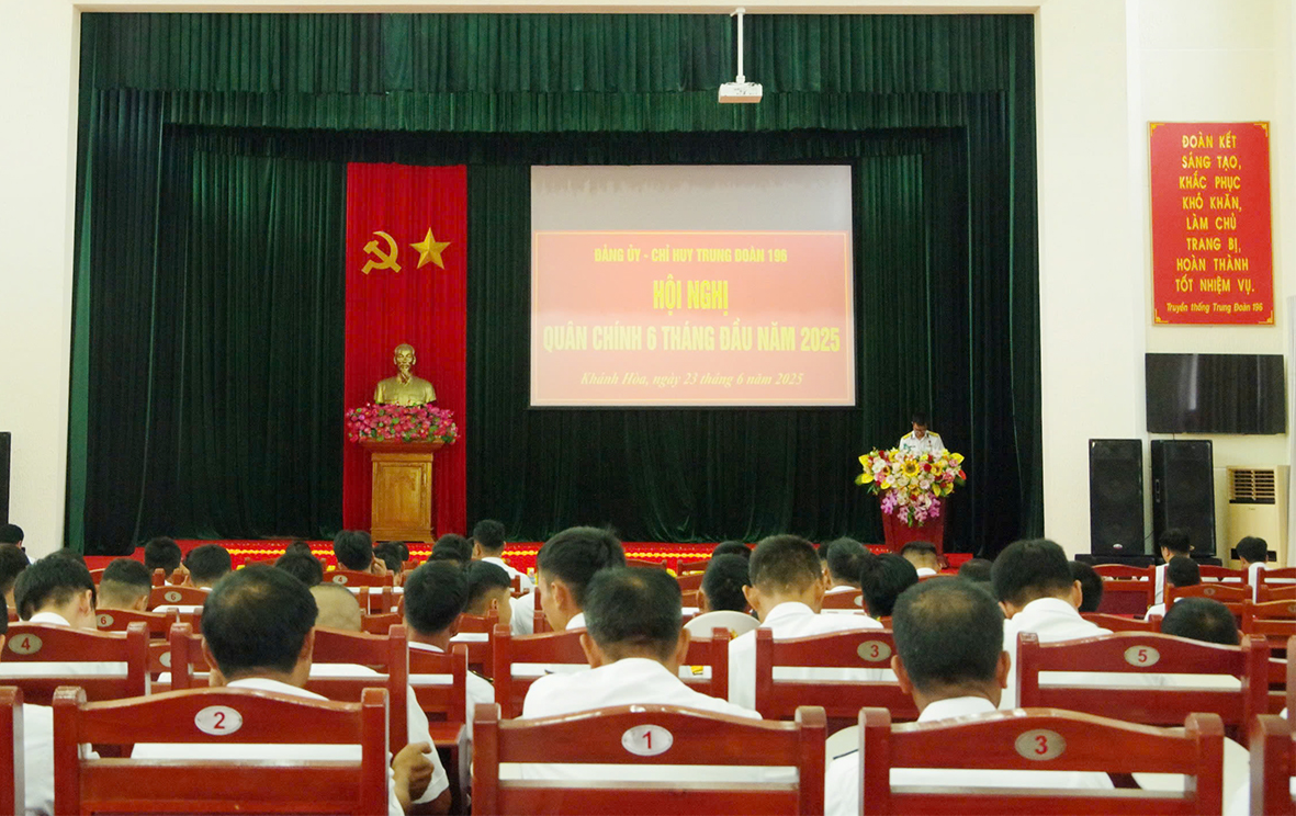 Chiều 23/6, tại TP. Cam Ranh, tỉnh Khánh Hòa, Trung đoàn 196 Hải quân tổ chức Hội nghị quân chính 6 tháng đầu năm 2025. Thượng tá Vũ Quảng, Trung đoàn trưởng chủ trì; Thượng tá Phạm Văn Sơn, Bí thư Đảng ủy, Chính ủy Trung đoàn quán triệt nghị quyết lãnh đạo thực hiện nhiệm vụ 6 tháng cuối năm 2025.