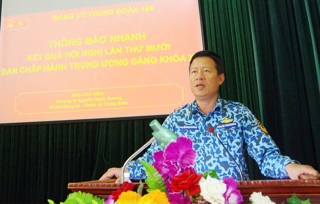 Chiều 17/10, tại TP. Cam Ranh, tỉnh Khánh Hoà, Đảng ủy Trung đoàn 196 Hải quân tổ chức thông báo kết quả Hội nghị lần thứ 10 Ban Chấp hành Trung ương Đảng Khóa XIII. Thượng tá Nguyễn Ngọc Dương, Bí thư Đảng uỷ, Chính ủy Trung đoàn chủ trì.