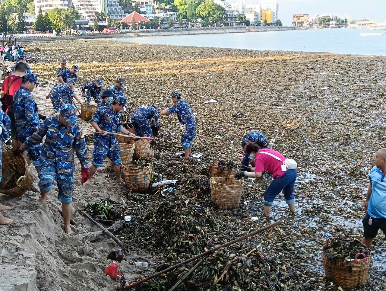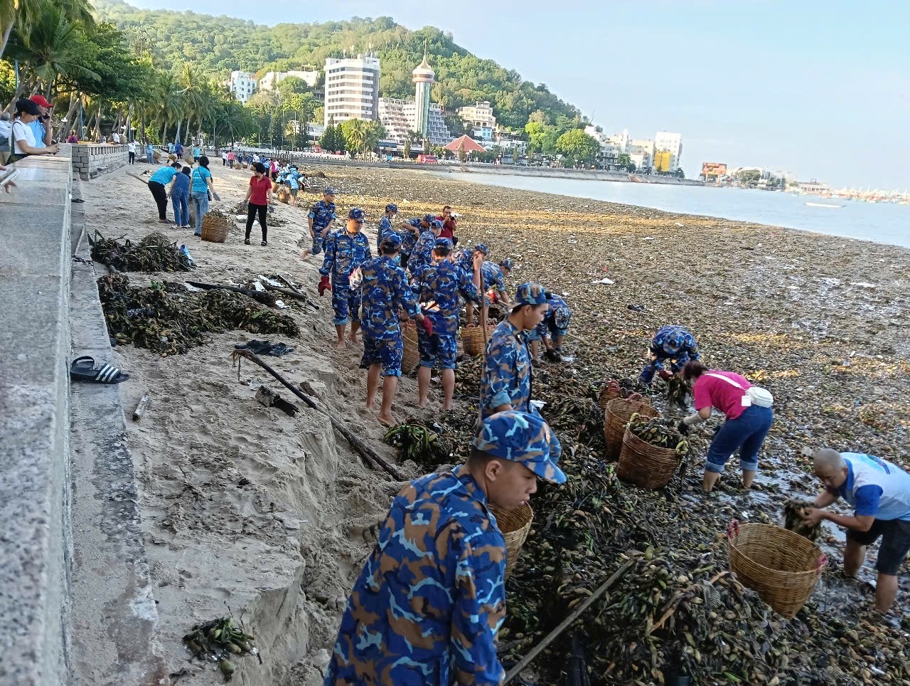 Trong buổi sáng, cán bộ, chiến sĩ Trung đoàn 251 đã phối hợp cùng các lực lượng tại chỗ tiến hành thu gom, xử lý hàng tấn rác thiên nhiên trôi dạt vào bờ biển.
