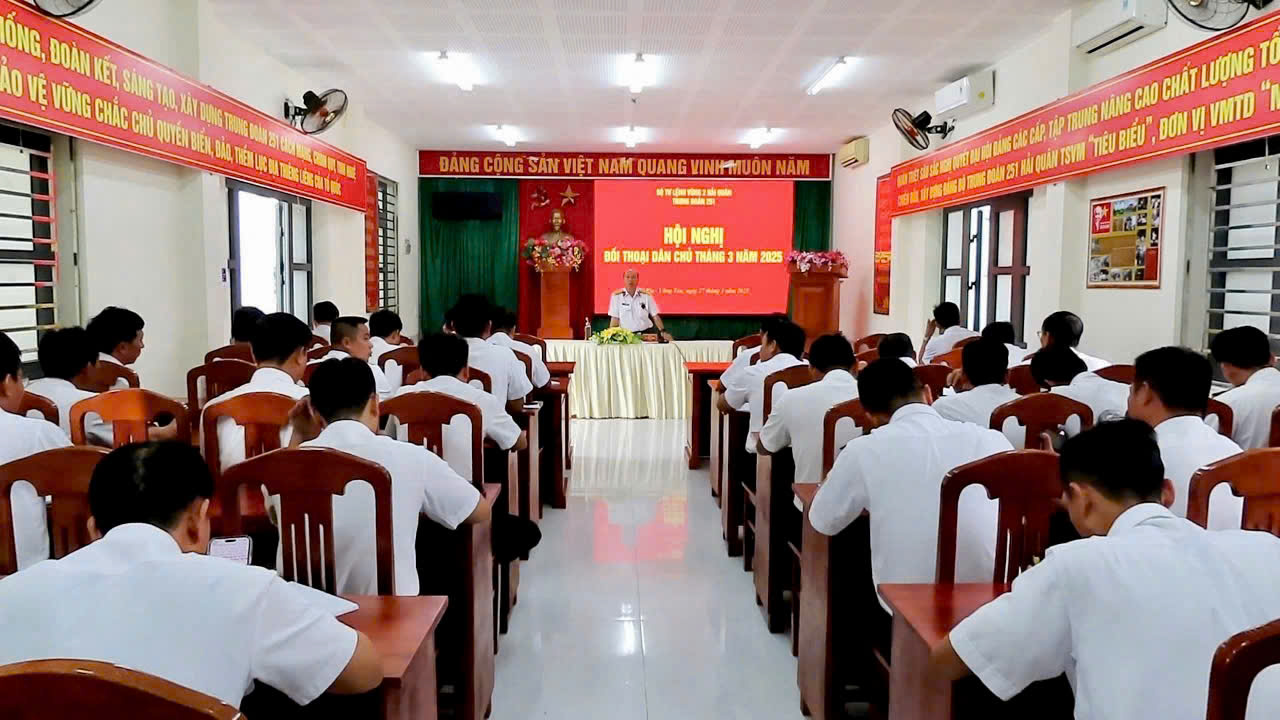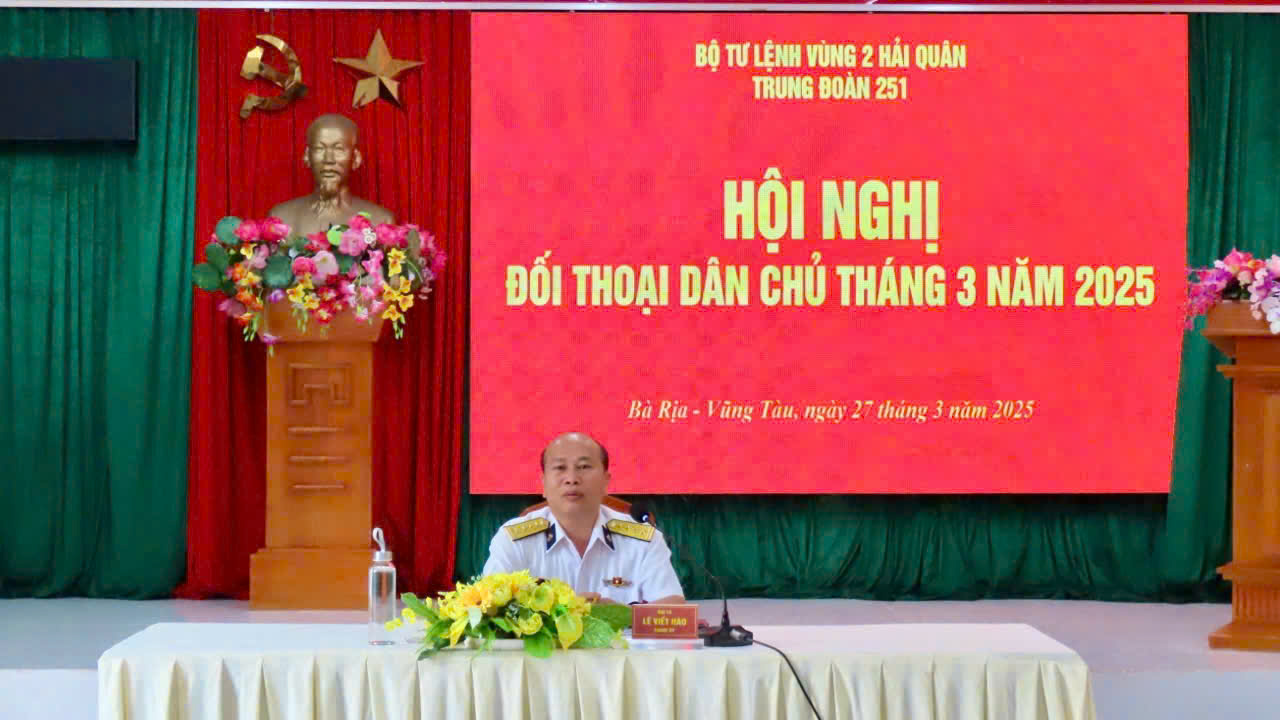 Sáng 27/3, tại TP. Vũng Tàu, Trung đoàn 251, Vùng 2 Hải quân tổ chức đối thoại dân chủ tháng 3/2025 và nói chuyện truyền thống “70 năm – Tự hào, vững vàng, tiến bước” chào mừng kỷ niệm 70 năm Ngày thành lập Hải quân nhân dân Việt Nam (7/5/1955 – 7/5/2025). Dự và chỉ đạo hội nghị có Đại tá Lê Viết Hào, Chính ủy Trung đoàn.