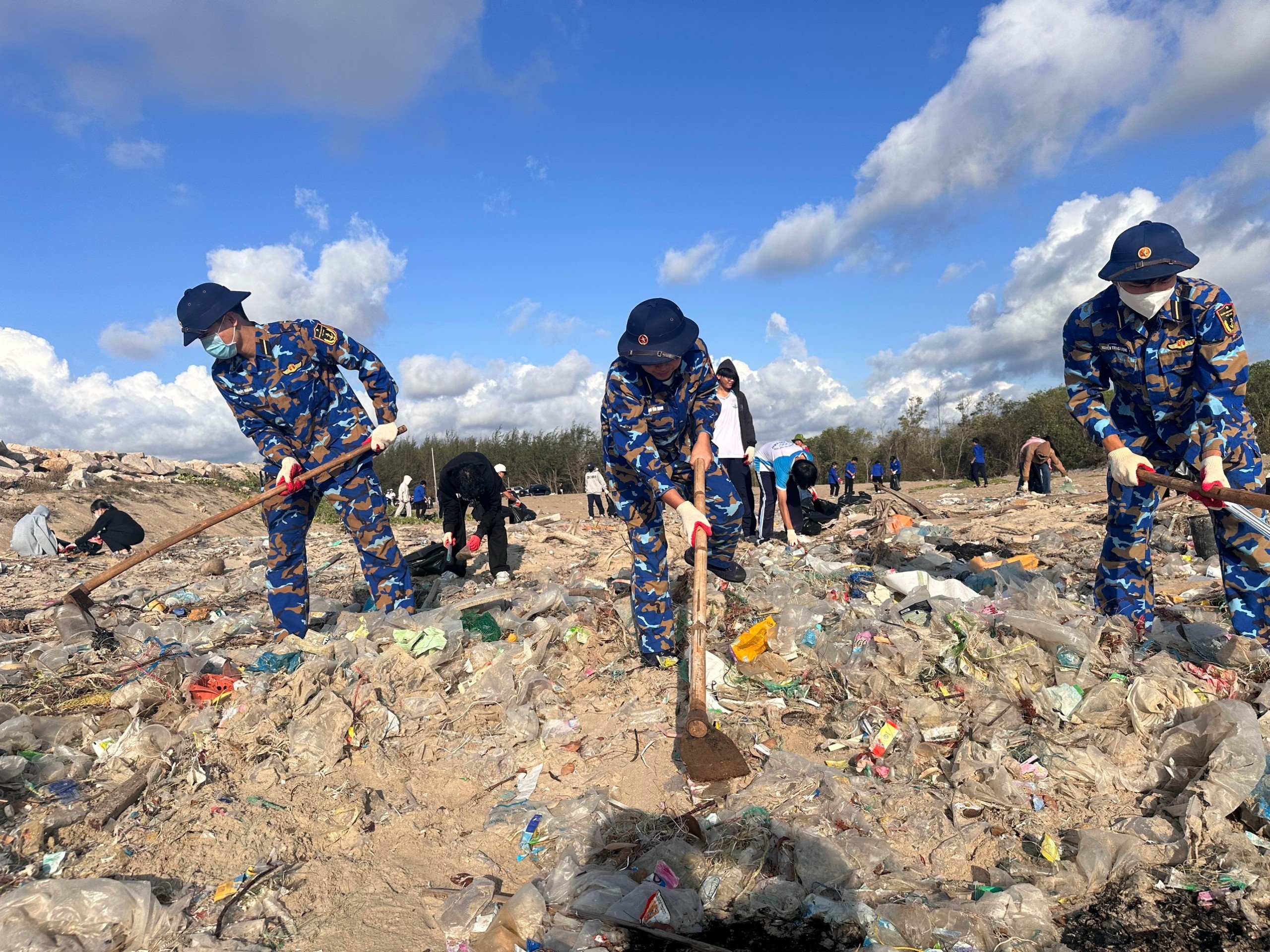 Cán bộ, chiến sĩ Trạm 2511 thu gom, xử lý rác thải làm sạch khu vực biển tại xã Lộc An