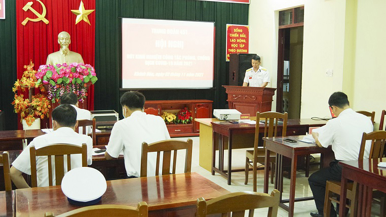 Chiều 2/11, tại TP.Cam Ranh, tỉnh Khánh Hòa, Trung đoàn 451, Vùng 4 Hải quân tổ chức Hội nghị rút kinh nghiệm công tác phòng, chống dịch Covid-19. Thượng tá Nguyễn Hữu Ngọc, Phó Trung đoàn trưởng, Trưởng ban chỉ đạo phòng, chống dịch Covid-19 Trung đoàn chủ trì.