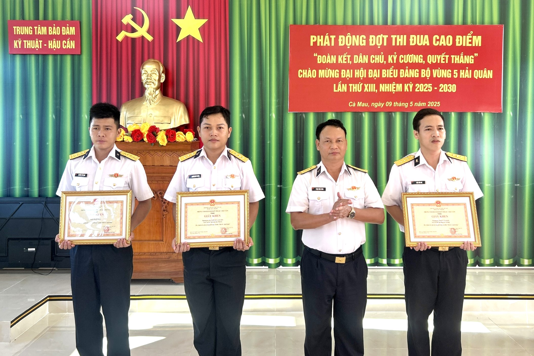 Dịp này, Trung tâm Bảo đảm kỹ thuật - hậu cần đã sơ kết và trao thưởng các tập thể, cá nhân có thành tích tốt trong đợt thi đua cao điểm “Thần tốc – Quyết thắng” chào mừng kỷ niệm 50 năm Ngày giải phóng miền Nam thống nhất đất nước (30/4/1975 - 30/4/2025), 70 năm Ngày thành lập Hải quân nhân dân Việt Nam (7/5/1955 - 7/5/2025) và 135 năm Ngày sinh Chủ tịch Hồ Chí Minh (19/5/1890 - 19/5/2025).