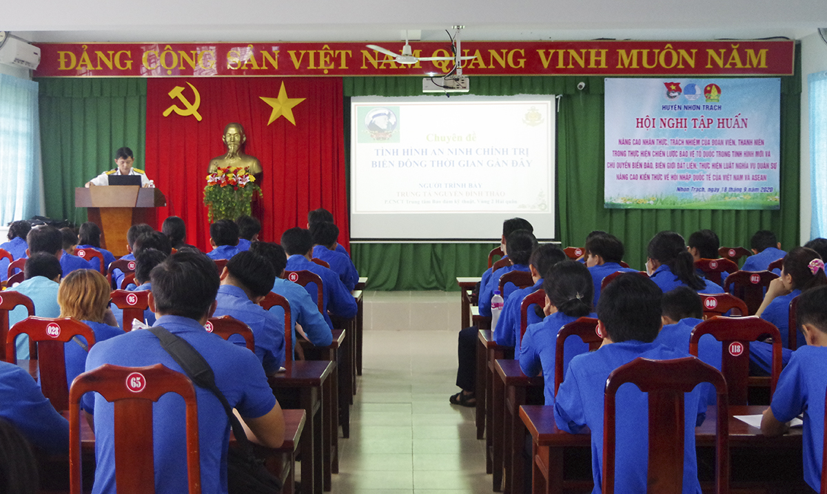 Ngày 18-9, tại Trung tâm Bồi dưỡng Chính trị huyện Nhơn Trạch, tỉnh Đồng Nai, Trung tâm Bảo đảm kỹ thuật Vùng 2 Hải quân tổ chức thông tin về biển, đảo cho hơn 200 cán bộ đoàn chủ chốt, đoàn viên thanh niên các xã và đơn vị hành chính trên địa bàn huyện Nhơn Trạch.