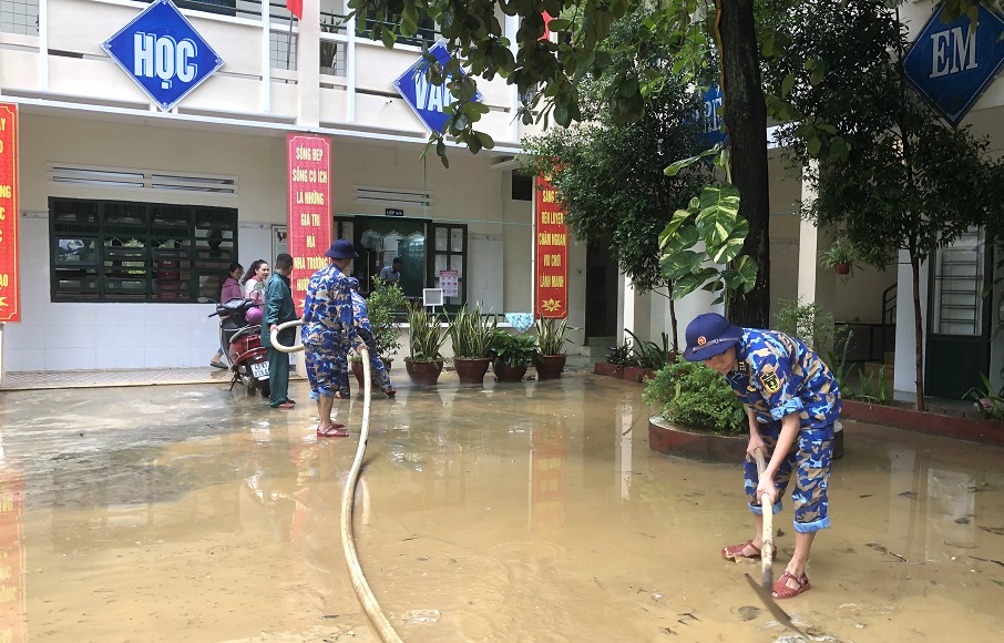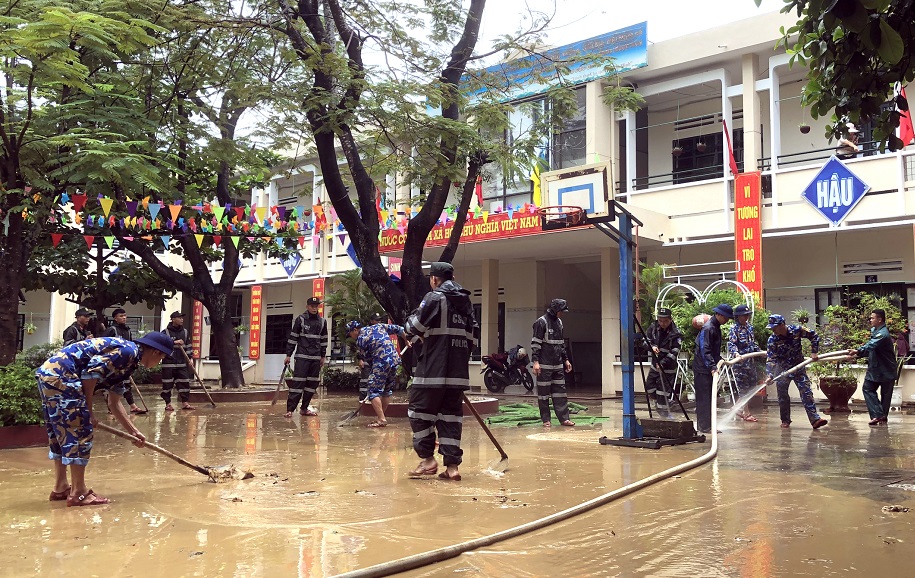 Chiều 15/10, Vùng 3 Hải quân điều động 20 cán bộ, chiến sĩ thuộc Trung tâm Bảo đảm kỹ thuật đến hỗ trợ Trường Tiểu học Lâm Quang Thự thuộc xã Hòa Phong, huyện Hòa Vang, thành phố Đà Nẵng khắc phục hậu quả sau mưa lũ.