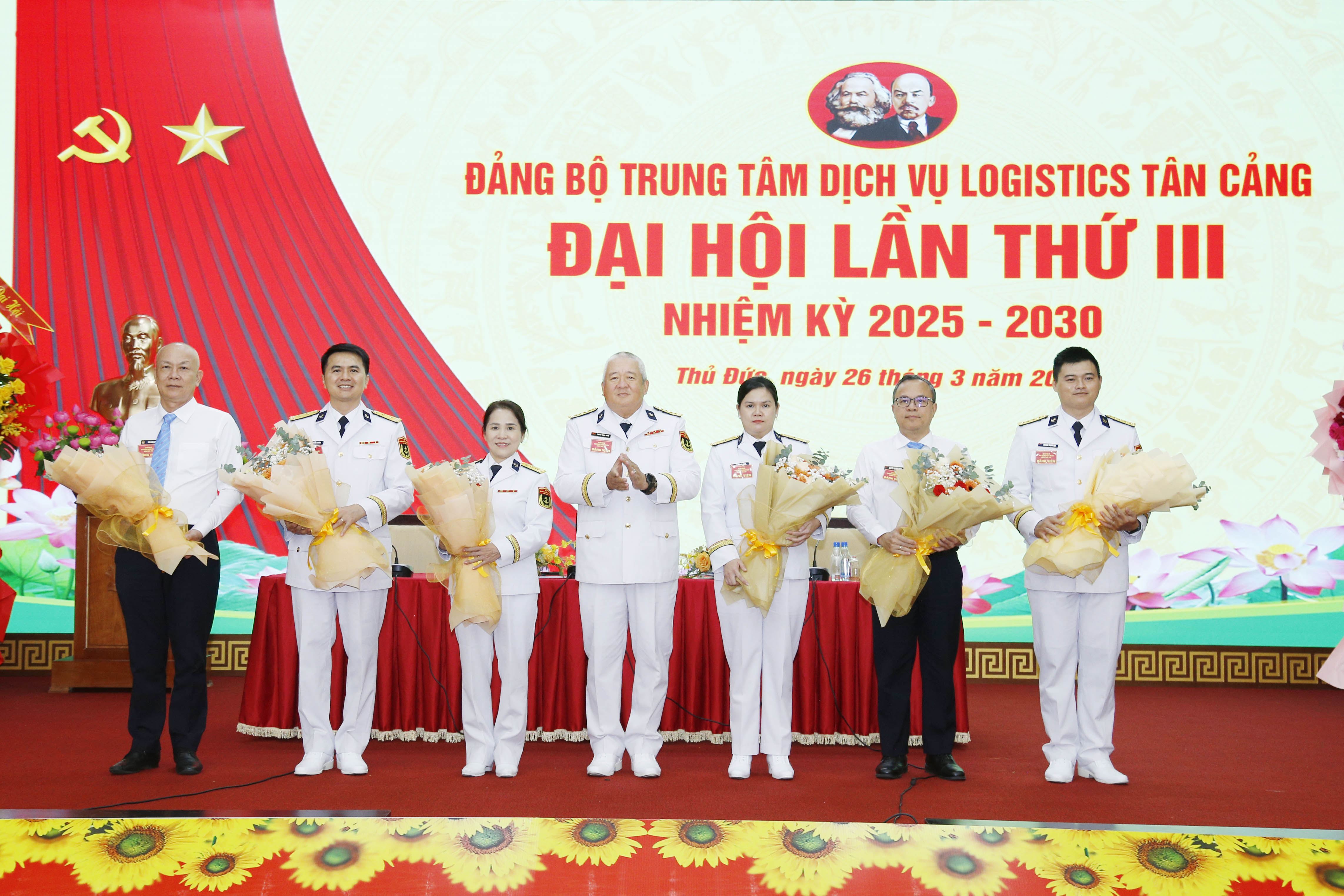 Đại tá Phùng Ngọc Minh tặng hoa chúc mừng Ban chấp hành Đảng bộ Trung tâm dịch vụ logistics Tân cảng, nhiệm kỳ 2025-2030