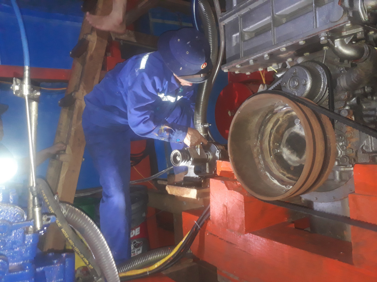 Thợ sửa chữa Trung tâm Hậu cần-kỹ thuật đảo Sinh Tồn tích cực khắc phục sự cố bơm làm mát máy phát điện tàu cá QNg 90708 TS