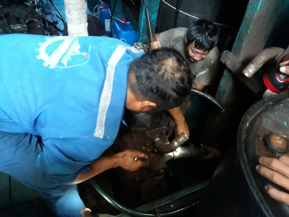 Thợ sửa chữa đang lắp ráp trong khoang máy tàu cá BTh 97751TS