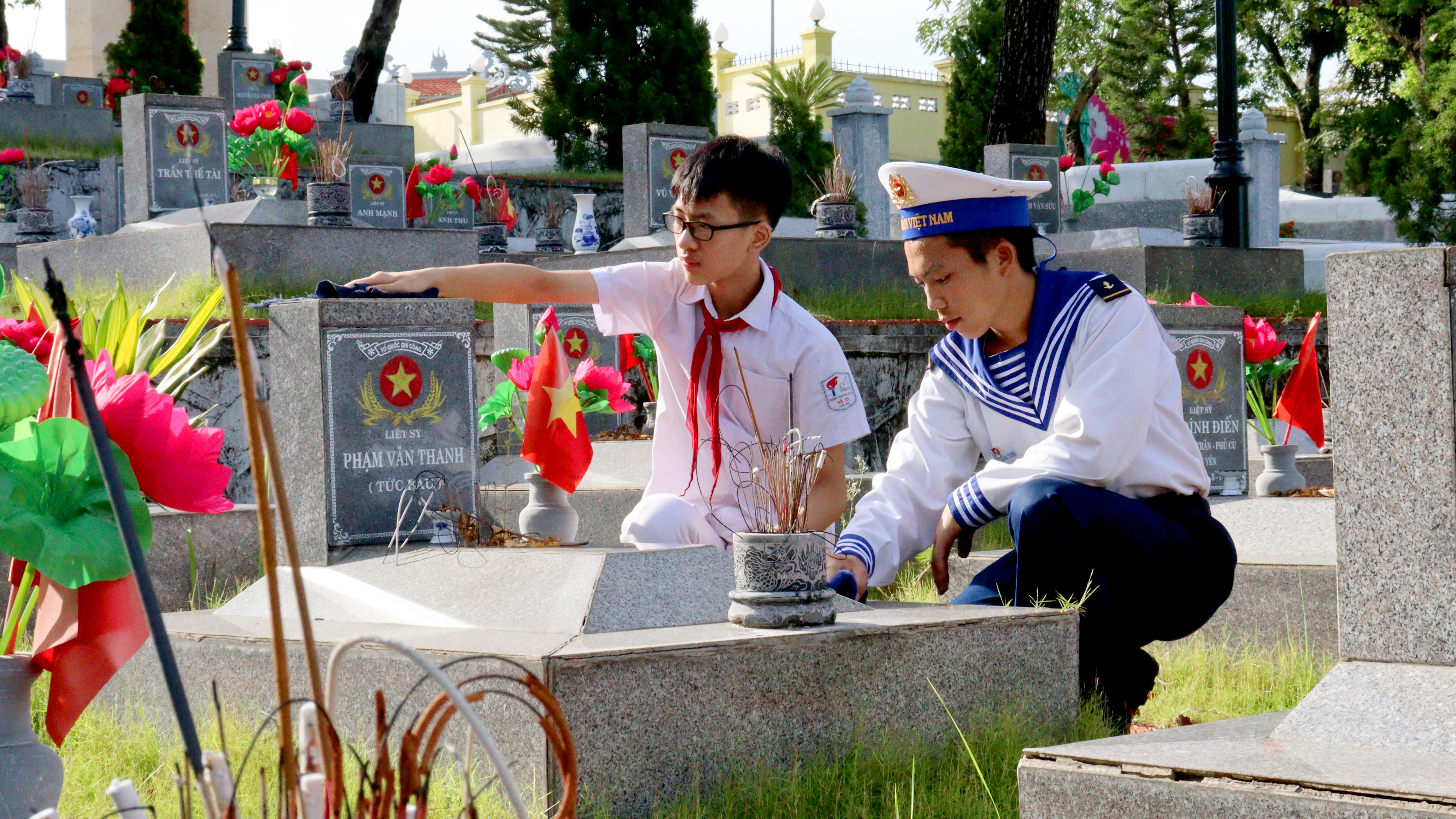Sau lễ dâng hương, cán bộ chiến sĩ Trung tâm, các thầy cô và học sinh trường THCS Hà Tu đã dọn dẹp làm đẹp khuôn viên nghĩa trang, khu vực các phần mộ của các anh hùng liệt sĩ.