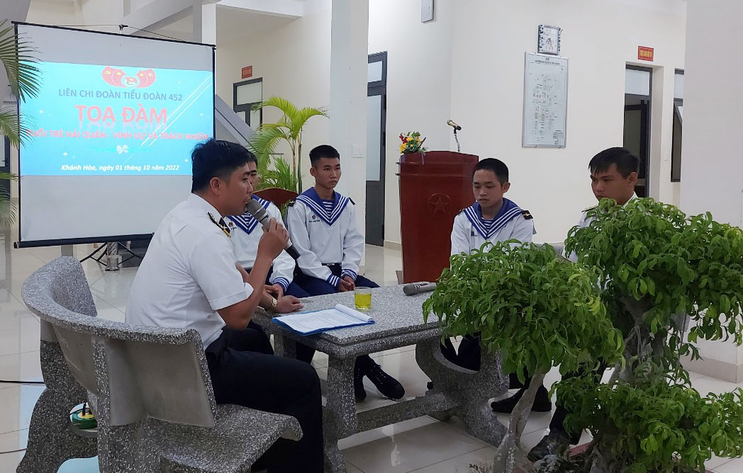 Tối 1/10, tại TP. Cam Ranh, tỉnh Khánh Hòa, các liên chi đoàn trực thuộc Đoàn cơ sở Trung tâm Huấn luyện Vùng 4 Hải quân tổ chức tọa đàm với chủ đề: “Tuổi trẻ Hải quân-Vinh dự và trách nhiệm”. Tham gia các buổi tọa đàm có gần 1.000 cán bộ, đoàn viên thanh niên thuộc Đoàn cơ sở.