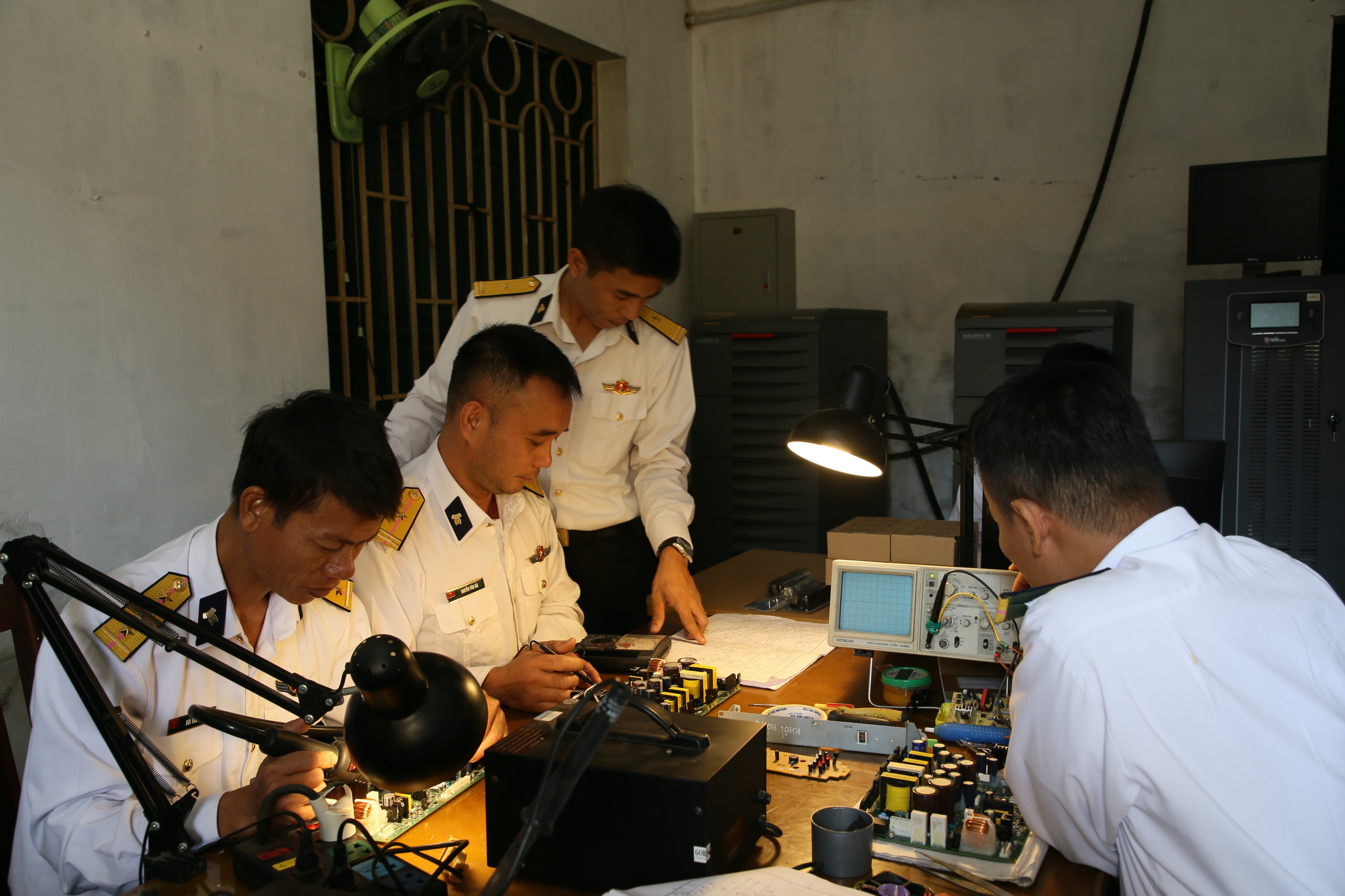 Chúng tôi tiếp tục đến nơi làm việc tạm thời của cán bộ, nhân viên kỹ thuật. Trong không gian nhỏ hẹp gần như đặt kín các trang, thiết bị, máy móc phục vụ công tác sửa chữa; đội ngũ kỹ thuật của Trung tâm chú tâm nghiên cứu sơ đồ mạch, sửa chữa các khối nguồn, khối phát của ra đa... Đại úy QNCN Bùi Văn Hiến, Kỹ thuật viên ra đa chia sẻ: Đây là các khối nguồn, khối phát (của trang bị ra đa) bị hỏng, các đơn vị gửi về để sửa chữa tại Trung tâm. Chúng tôi cơ bản đã sửa chữa thành công.