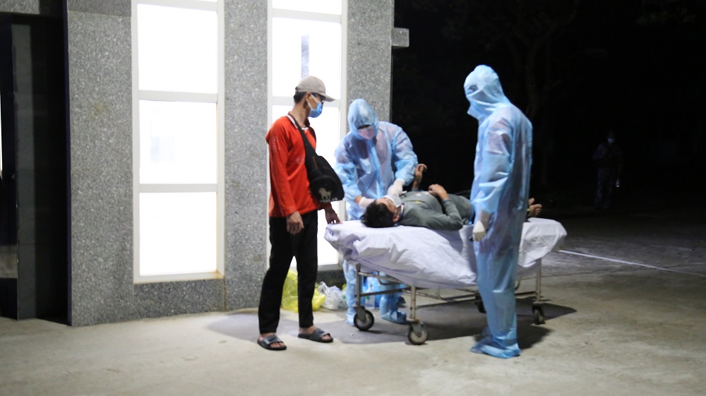 Trong quá trình tiếp nhận và cấp cứu bệnh nhân, cán bộ, chiến sĩ đảo Trường Sa chấp hành nghiêm các quy định phòng chống dịch Covid-19.