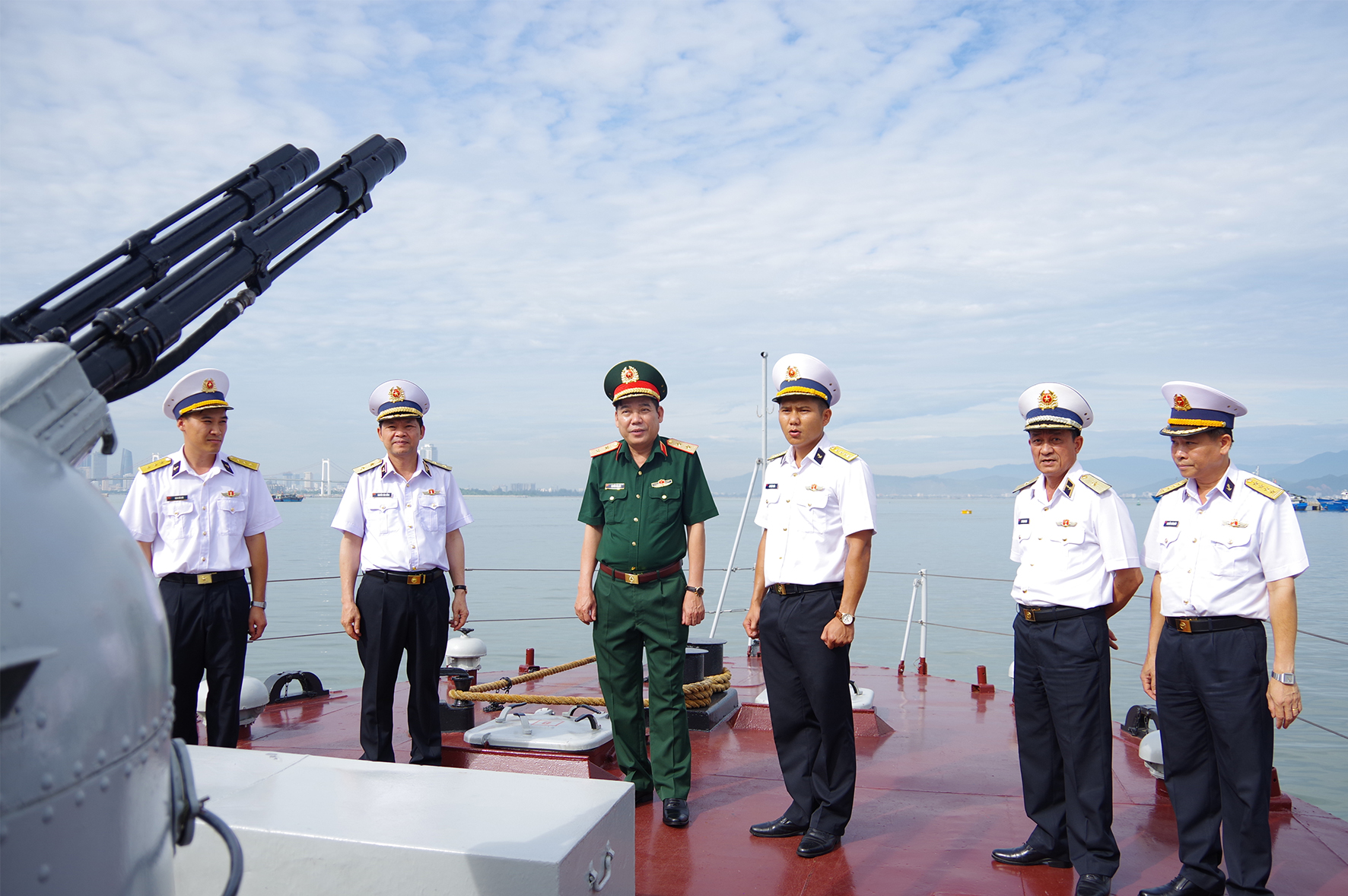 Trung tướng Nguyễn Văn Bổng, Bí thư Đảng ủy, Chính ủy Hải quân; Đại tá Nguyễn Thiên Quân, Tư lệnh Vùng và Chuẩn Đô đốc Mai Trọng Định, Bí thư Đảng ủy, Chính ủy Vùng 3 tiếp và làm việc với đoàn.