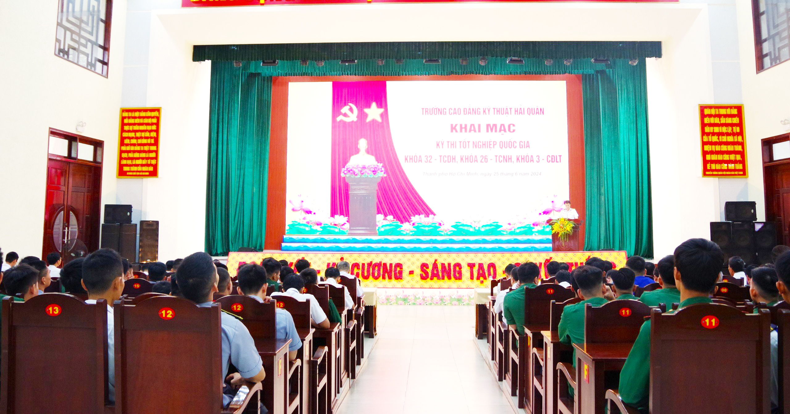 Ngày 25/6, tại TP. Hồ Chí Minh, Trường Cao đẳng kỹ thuật Hải quân tổ chức khai mạc kỳ thi tốt nghiệp năm 2024 cho các đối tượng đào tạo trung cấp dài hạn tập trung Khóa 32, Trung cấp ngắn hạn tập trung Khóa 26 và Khóa 3 Cao đẳng liên thông. Đại tá Đỗ Ngọc Hiểu, Hiệu trưởng Nhà trường, Chủ tịch Hội đồng thi tốt nghiệp chủ trì.