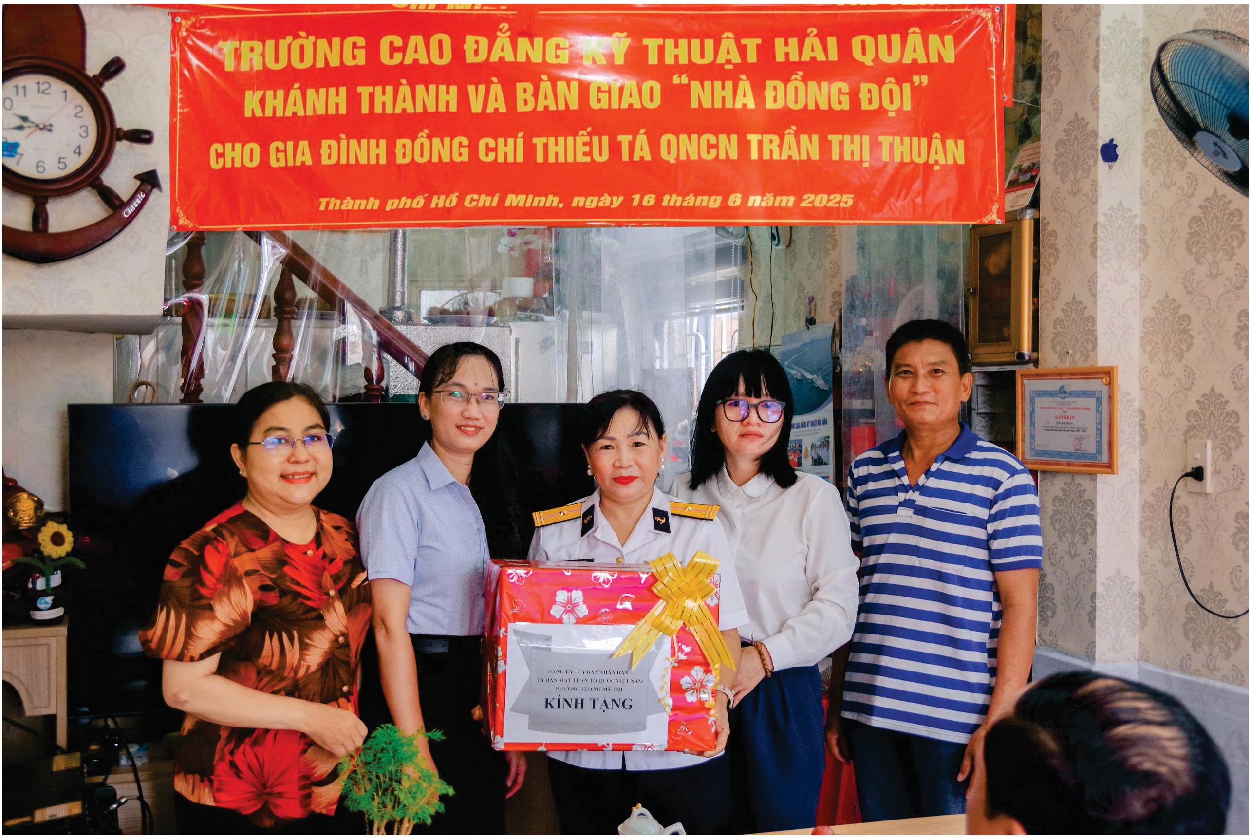 Sáng 16/6, tại phường Thạnh Mỹ Lợi, TP Thủ Đức, TP Hồ Chí Minh, Trường Cao đẳng Kỹ thuật Hải quân phối hợp với cấp ủy, chính quyền địa phương tổ chức khánh thành, bàn giao nhà đồng đội tặng gia đình Thiếu tá QNCN Trần Thị Thuận, Nhân viên Phòng Đào tạo.