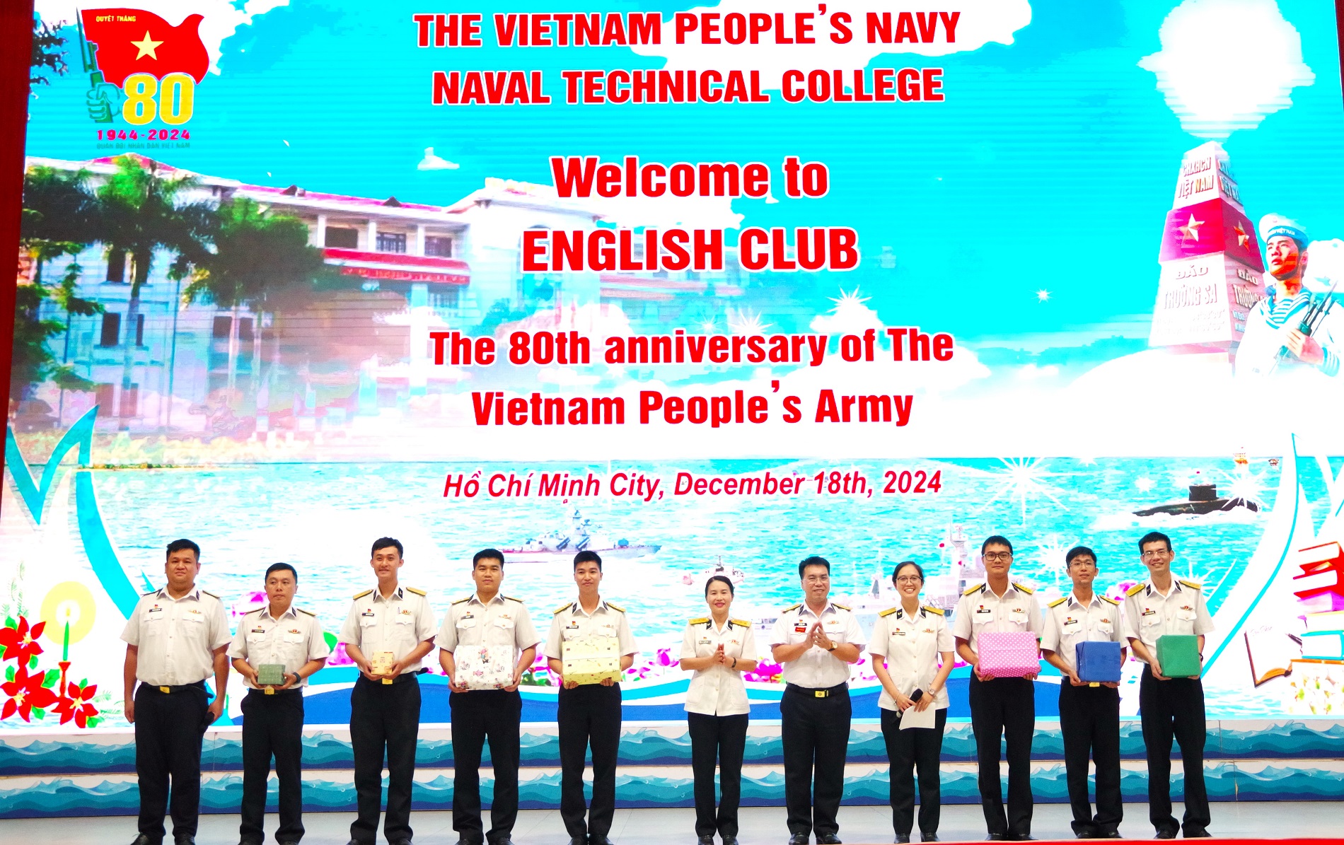 Chiều 18/12, tại TP. Hồ Chí Minh, Câu lạc bộ tiếng Anh của Trường Cao đẳng Kỹ thuật Hải quân đã tổ chức sinh hoạt tháng 12 với Chủ đề: “The 80th Anniversary of the Vietnam People’s Army - Kỷ niệm 80 năm Ngày thành lập Quân đội nhân dân Việt Nam”.