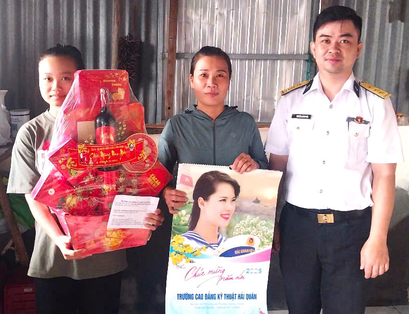 Đại diện Trường CĐKT Hải quân đã trao các phần quà của Quân chủng Hải quân và Trường CĐKT Hải quân tặng cháu Trần Thị Kim Anh và cháu Huỳnh Nguyễn Thúy như và gia đình. Mỗi cháu một phần quà trị giá 8,5 triệu đồng.