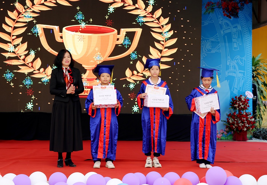 Lãnh đạo Phòng Giáo dục huyện An Lão trao thưởng 3 thí sinh xuất sắc nhất phần thi "Rung chuông vàng"