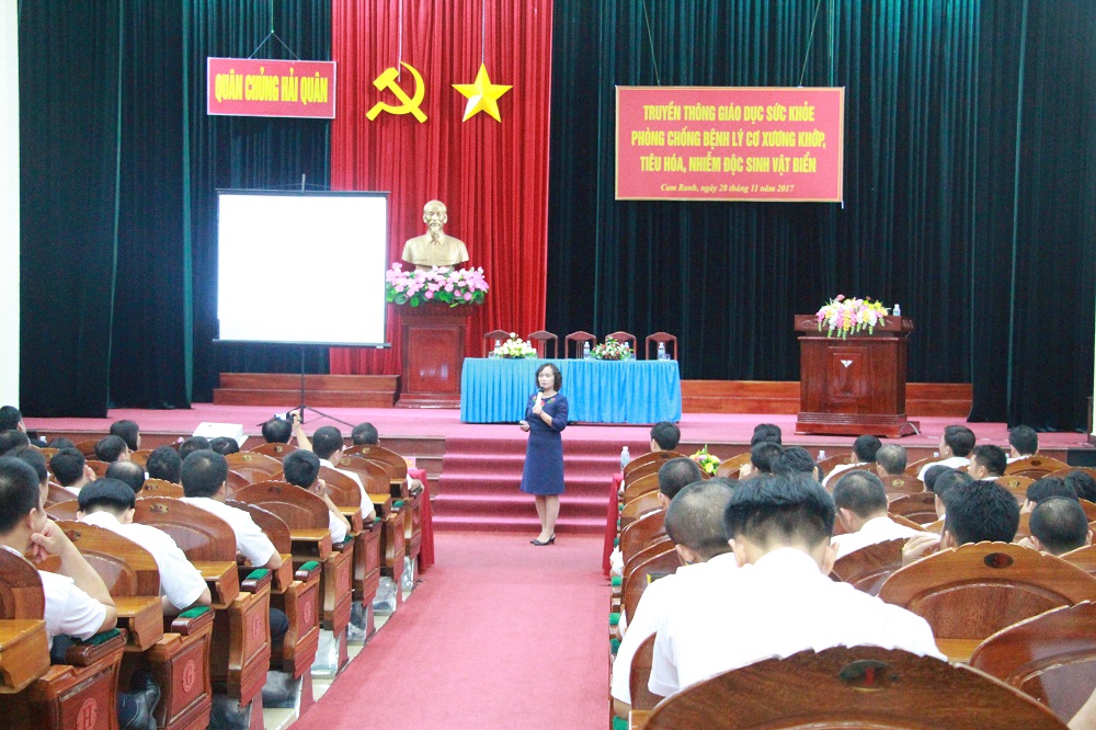 Tối 28-11, tại Lữ đoàn 189, TP.Cam Ranh, tỉnh Khánh Hoà, Cục Hậu cần Hải quân phối hợp với Bệnh viện Bạch Mai, Viện Hải Dương học Nha Trang tổ chức truyền thông giáo dục sức khỏe phòng chống bệnh cơ xương khớp, tiêu hóa, nhiễm độc sinh vật biển cho hơn 300 cán bộ, thủy thủ tàu ngầm Lữ đoàn 189 Hải quân.