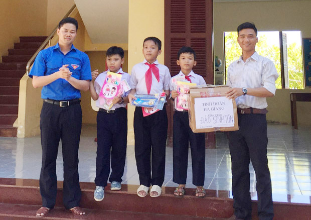 Đồng chí Vũ Mạnh Hà, Tỉnh ủy viên, Bí thư Tỉnh đoàn tặng quà các cháu học sinh Trường tiểu học Sinh Tồn