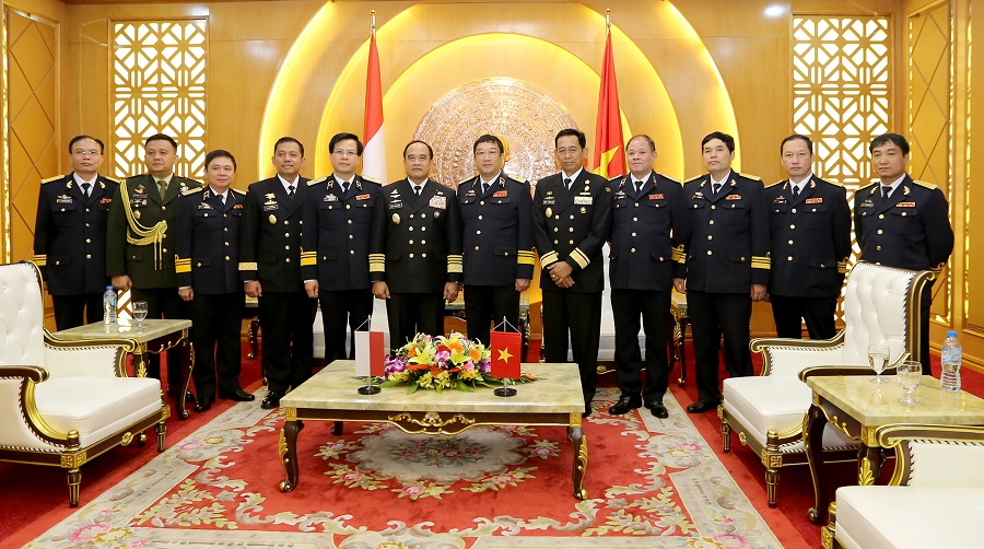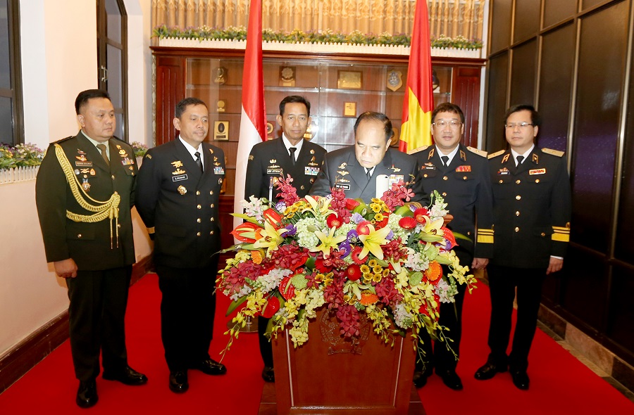 Trong khuôn khổ chuyến thăm, Đoàn cán bộ Hải quân Indonesia đi tham quan Vịnh Hạ Long, chào xã giao thủ trưởng Bộ Quốc phòng.