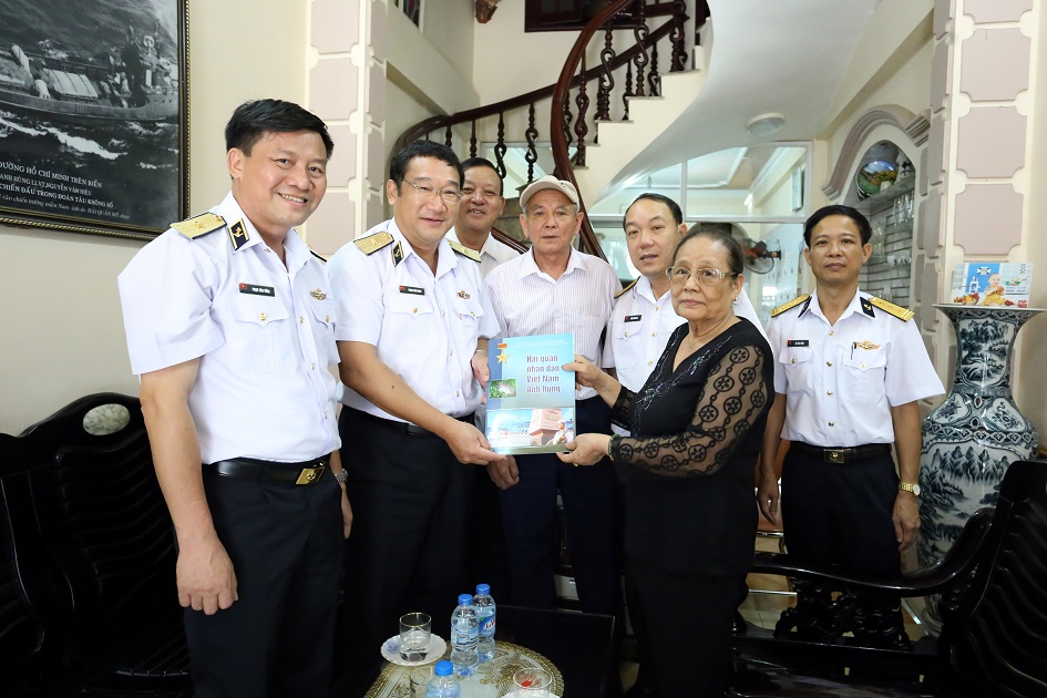Chuẩn Đô đốc Phạm Hoài Nam tặng quà bà Phạm Thị Vi, vợ Anh hùng-Liệt sĩ Nguyễn Văn Hiệu, nguyên cán bộ Đoàn 125 ở phường Trần Khánh Dư, TP. Hải Phòng