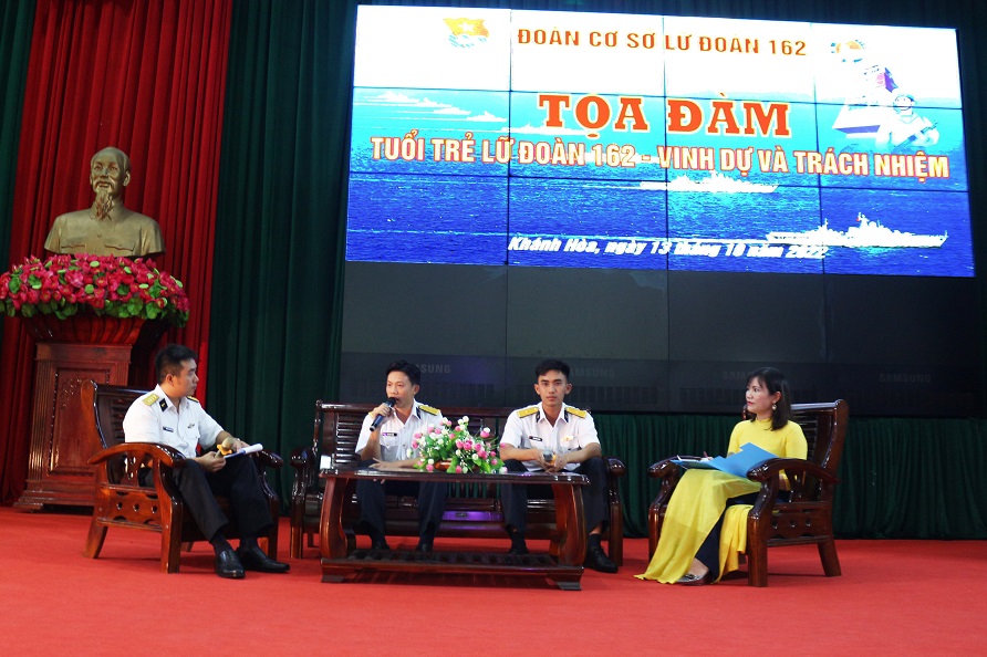 Chào mừng thành công Đại hội đại biểu Đoàn TNCS Hồ Chí Minh Quân đội lần thứ X, nhiệm kỳ 2022-2027, tối 13/10, tại TP. Cam Ranh, tỉnh Khánh Hoà, Đoàn cơ sở Lữ đoàn 162, Vùng 4 Hải quân tổ chức tọa đàm với chủ đề “Tuổi trẻ Lữ đoàn 162 - Vinh dự và trách nhiệm”.