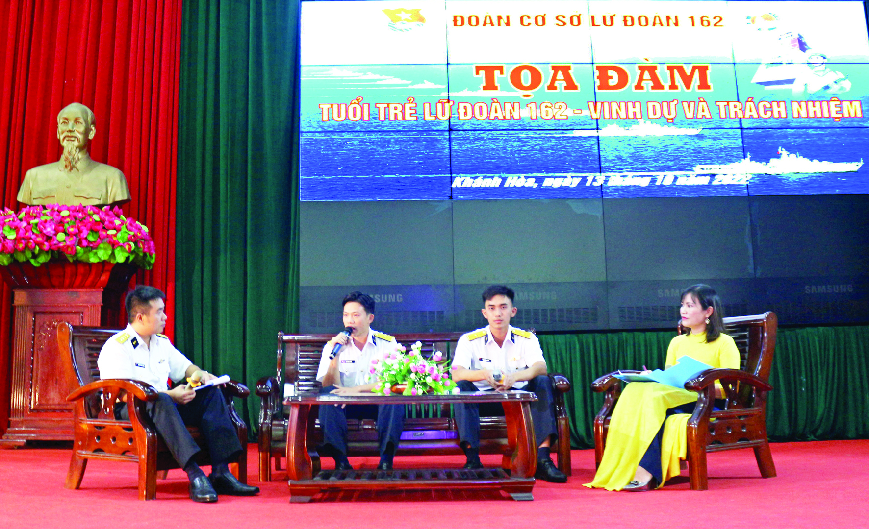 Vừa qua, Đoàn cơ sở (ĐCS) Lữ đoàn 162 tổ chức tọa đàm thanh niên với chủ đề “Tuổi trẻ Lữ đoàn 162-Vinh dự và trách nhiệm”. Tham gia tọa đàm, đại diện liên chi đoàn các hải đội, chi đoàn các phòng, các tàu đã sôi nổi trao đổi, thảo luận về: Lý tưởng, bản lĩnh, tri thức, kỹ năng, sức khỏe và vai trò xung kích, trách nhiệm của cán bộ, đoàn viên thanh niên (ĐVTN). Nhiều ý kiến nêu cao vị trí, vai trò, niềm tự hào của cán bộ, ĐVTN Lữ đoàn 162. Nhận thức, trách nhiệm của tuổi trẻ gắn với thực hiện chương trình hành động của đại hội đoàn các cấp và phong trào thi đua: “Thanh niên Hải quân rèn đức, luyện tài; xung kích, sáng tạo; đoàn kết, lập công; xứng danh Bộ đội Cụ Hồ-Người chiến sĩ Hải quân thời kỳ mới”...