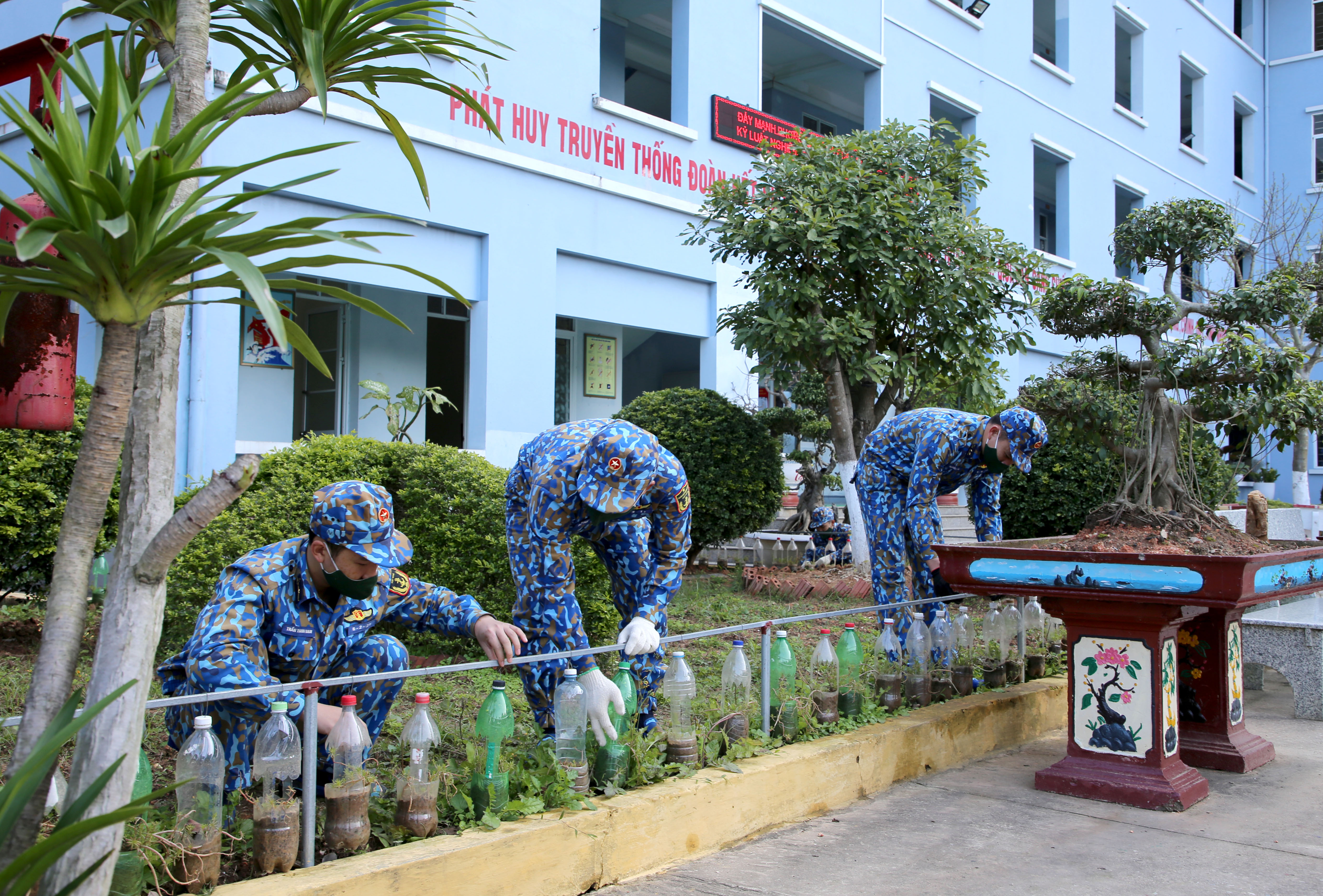 Những vỏ chai nhựa được tuổi trẻ Hải đội 7 tái chế thành những giỏ trồng hoa trang trí trong khuôn viên đơn vị