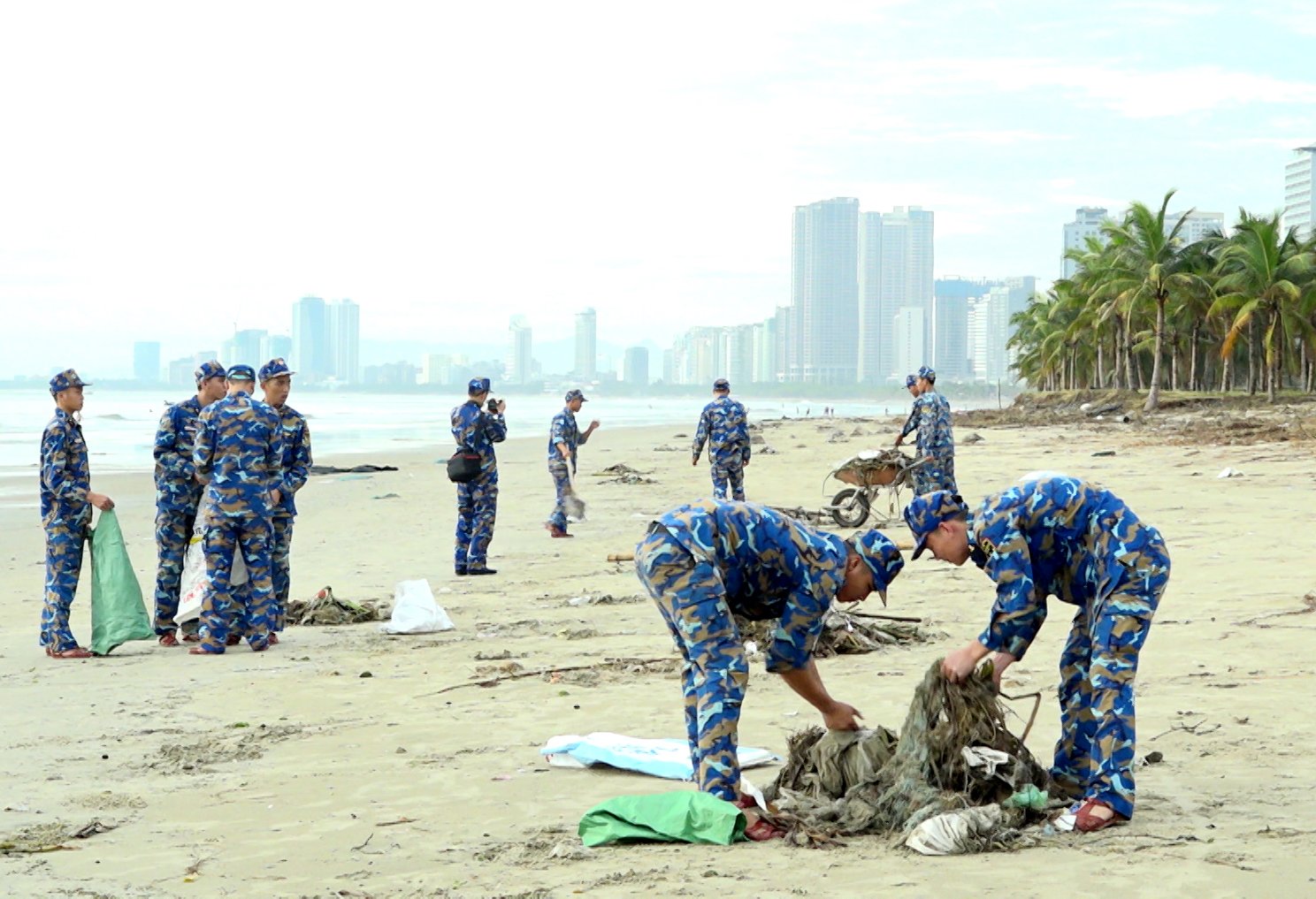 Cán bộ, chiến sĩ thu gom, tập kết hàng chục tấn rác thải trên bãi biển