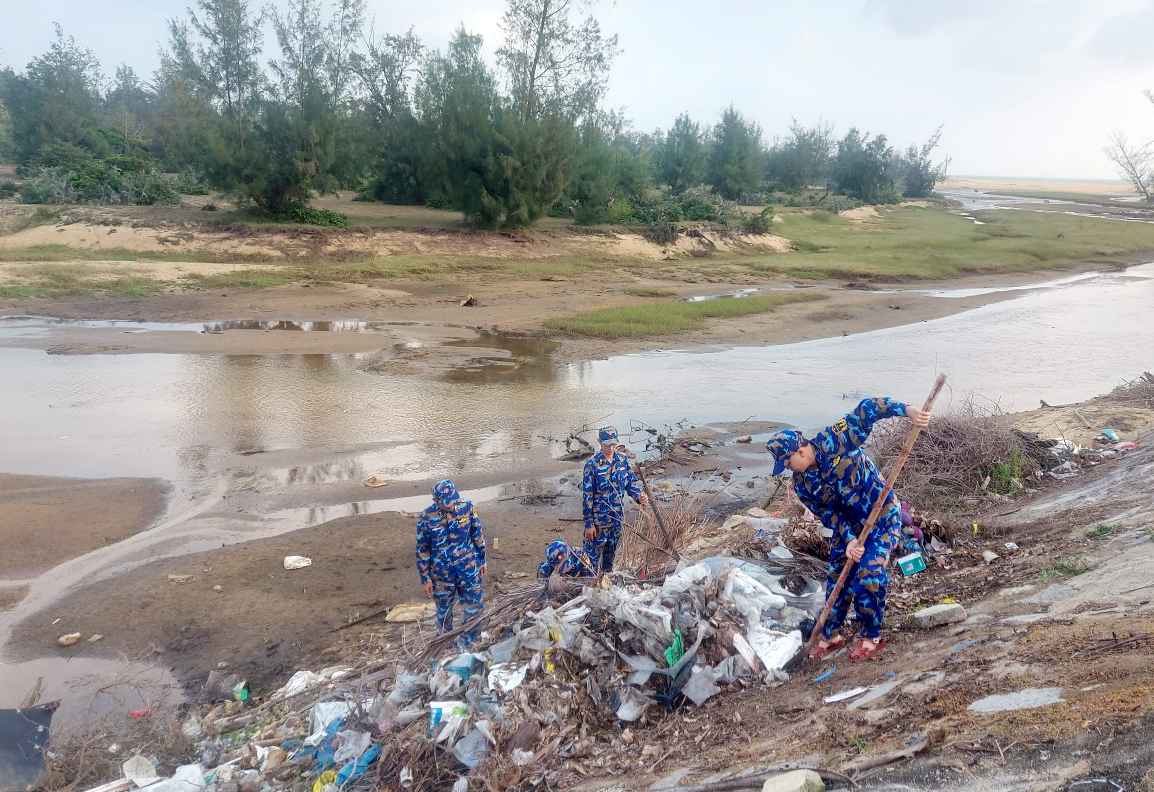 Đoàn viên thanh niên Trạm ra đa 3512 thuộc Trung đoàn 351 thu gom rác thải làm sạch bờ biển huyện Phù Cát, tỉnh Bình Định