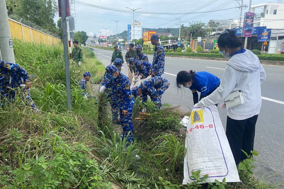 Đoàn viên thanh niên các đơn vị phát quang bụi rậm, thu gom rác thải