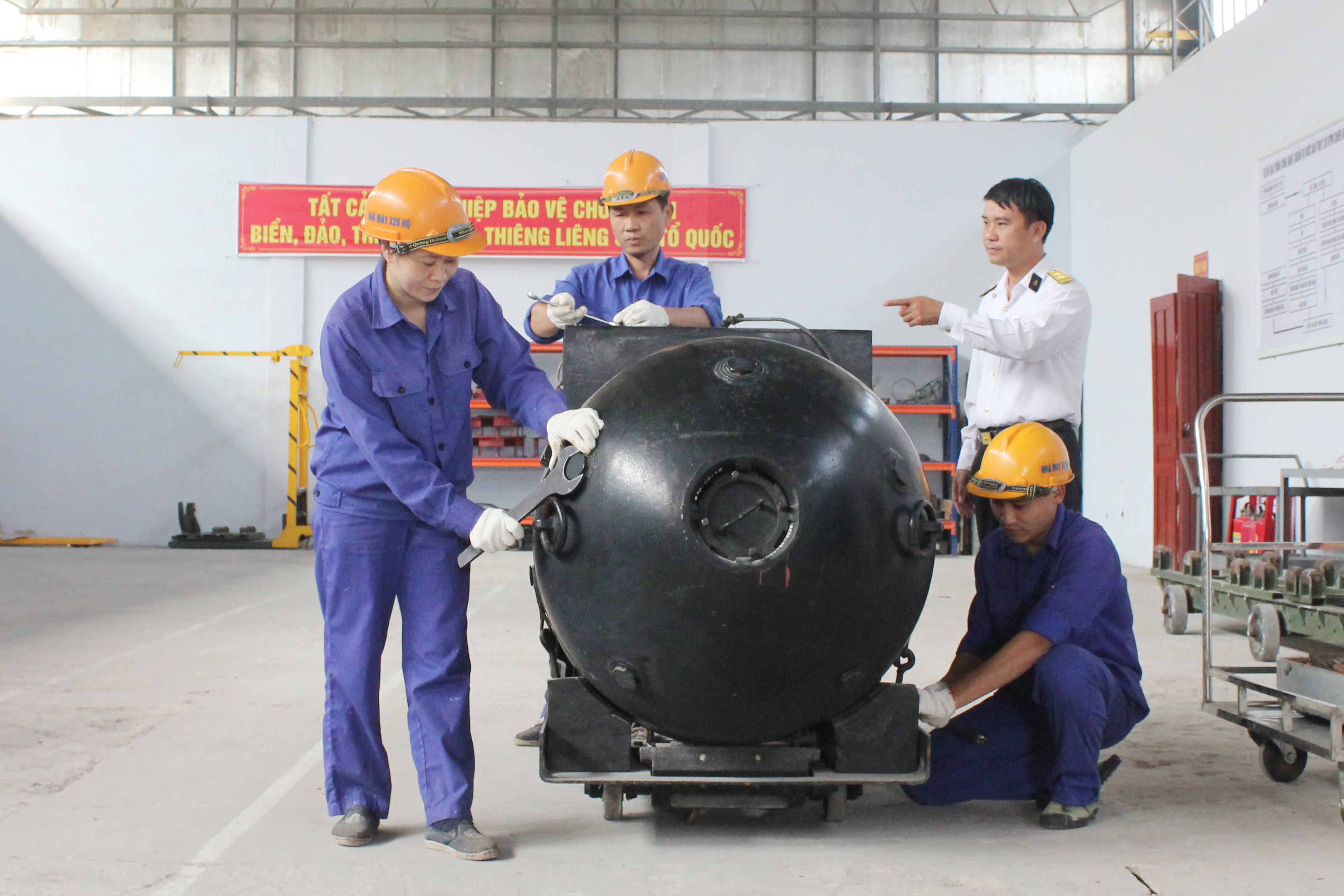 Thợ kỹ thuật hiệu chỉnh thông số của thiết bị kiểm tra thủy lôi