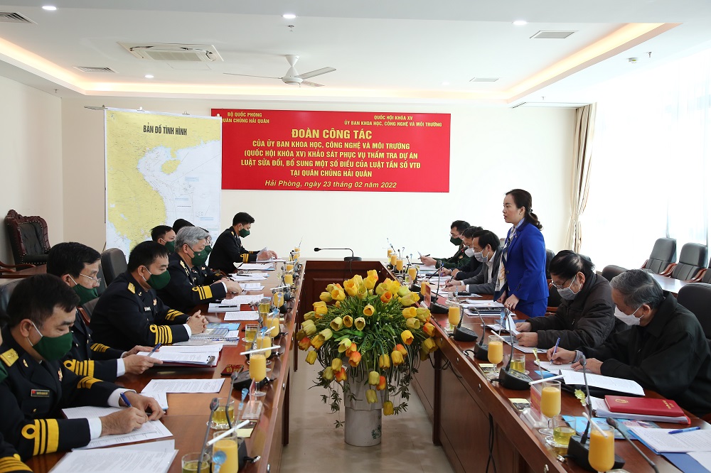 Cũng tại buổi làm việc, đoàn công tác Ủy ban Khoa học, Công nghệ và Môi trường của Quốc hội đã nghe những ý kiến đóng góp của Quân chủng Hải quân vào dự thảo Luật Sửa đổi, bổ sung một số điều của Luật Tần số VTĐ.