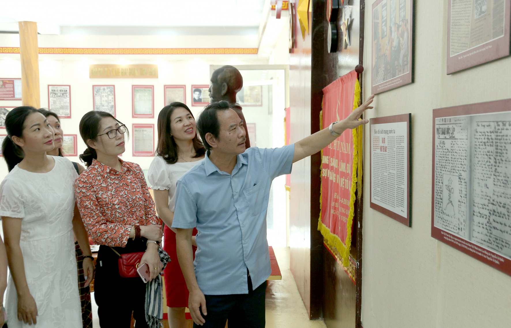 Đoàn tham quan nhà trưng bày báo chí Khu di tích lịch sử quốc gia nơi ra đời Hội Nhà báo Việt Nam. Ảnh: Hoàng Thi