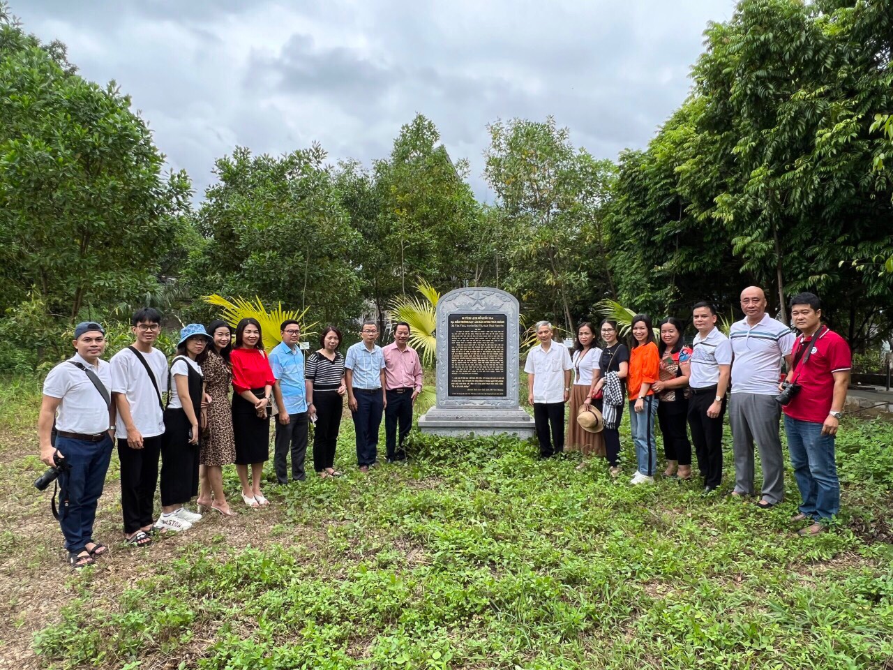 Đoàn chụp ảnh lưu niệm tại bia di tích nơi ra đời Trường dạy viết báo Việt Nam. Ảnh: Hoàng Thi